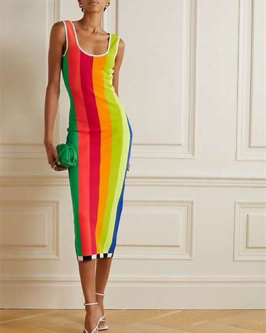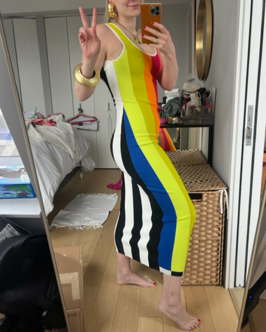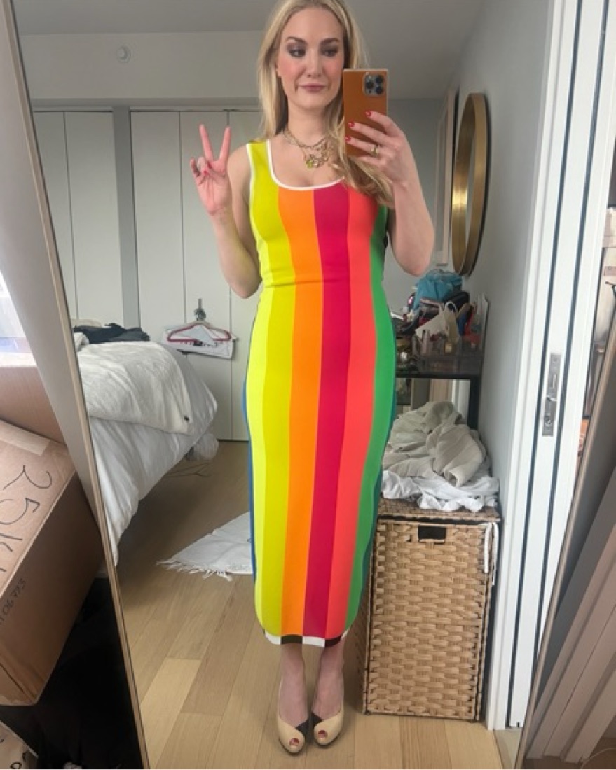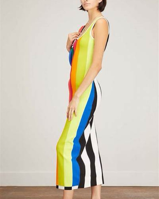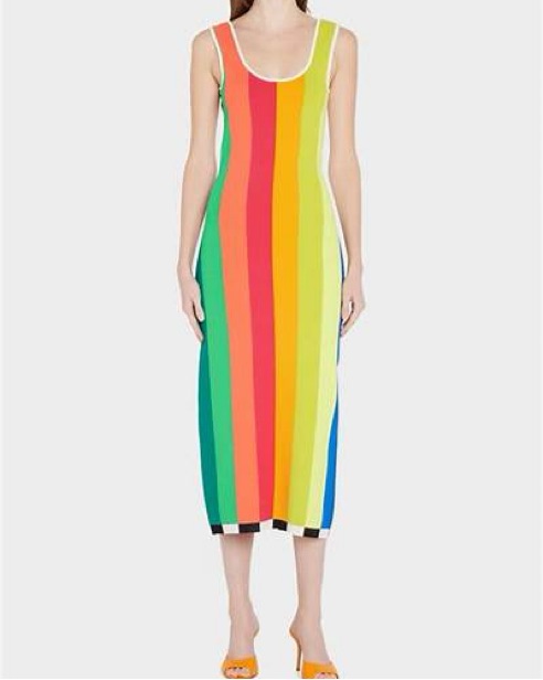 CJR knit stripe dress. Rainbow stripes in the front with a low scoop back and black and white stripes in the back. Fitted but flattering the straps are a little long so it fits better if you are tall! Im 5’8!