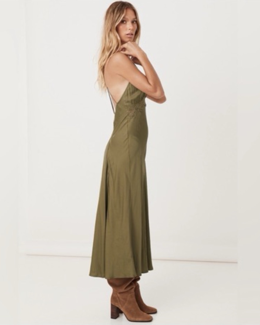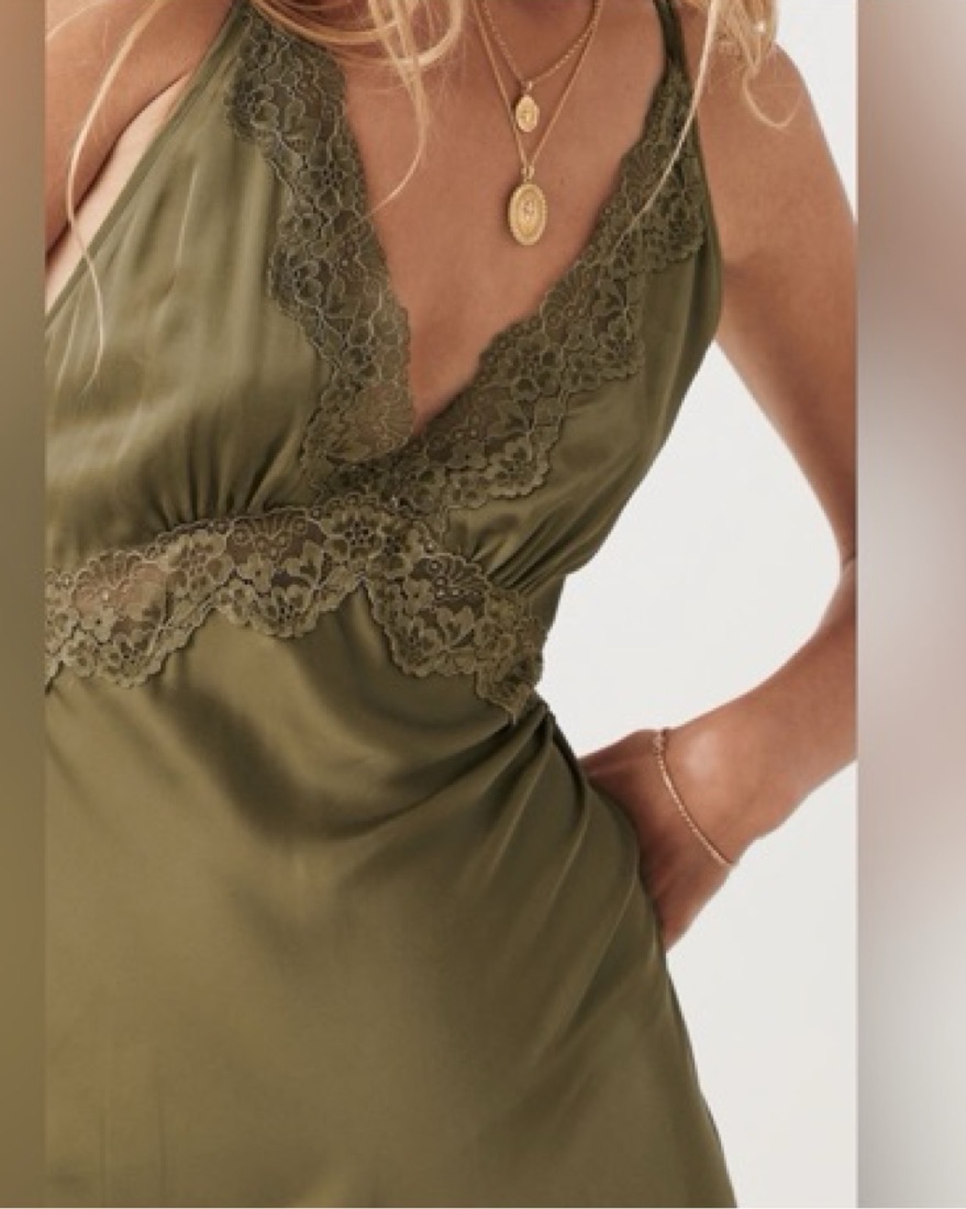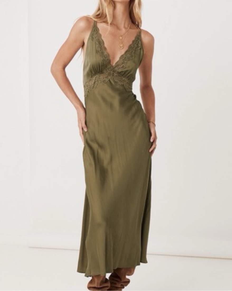 Olive Green - Inspired by 1930s nighties, the Boudoir slip dress is a classic style elevated with lace inserts, fixed double cross over spaghetti straps and a low V back that flatters the back and shapes the derriere. Throw this on paired with a tied flannel at the waist and chunky boots and you are