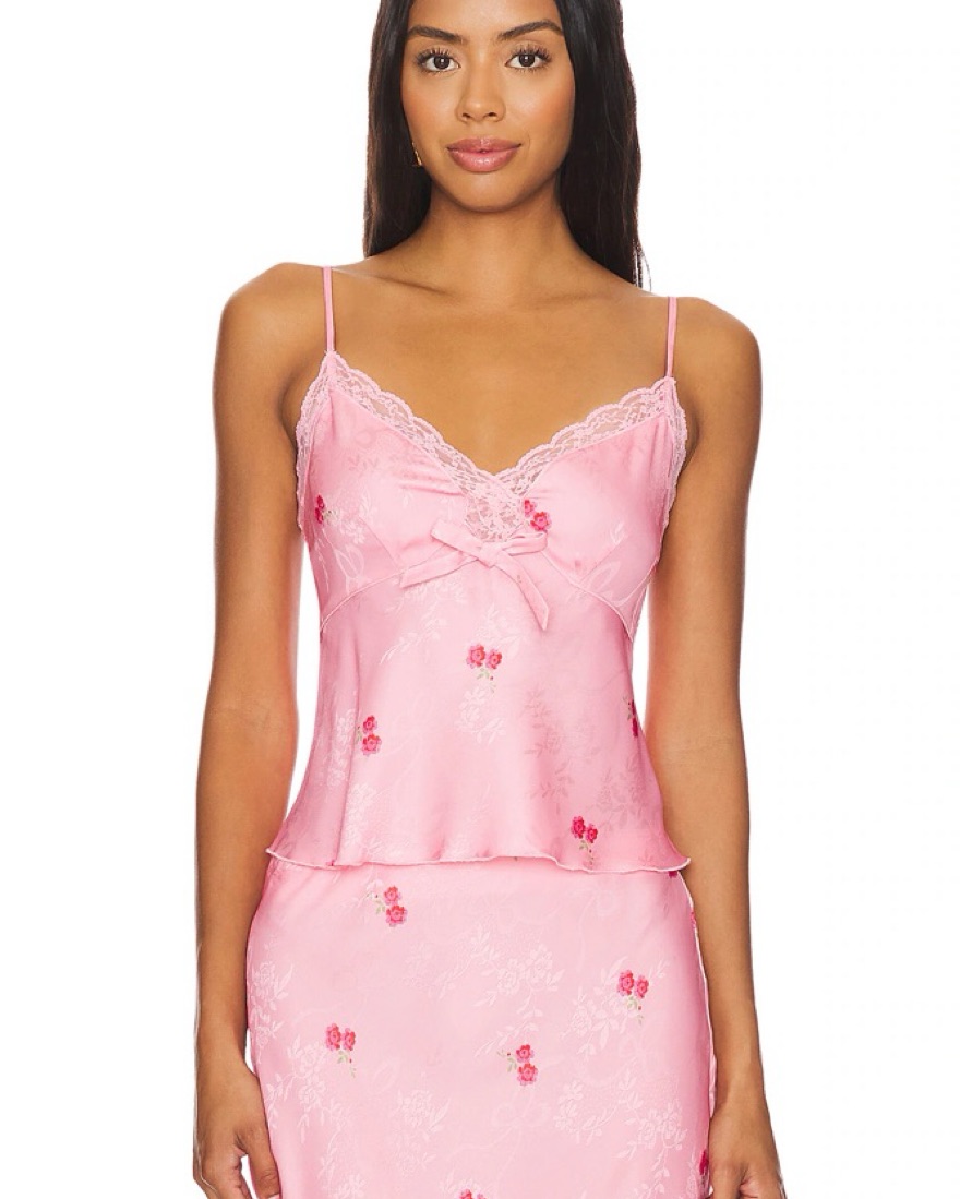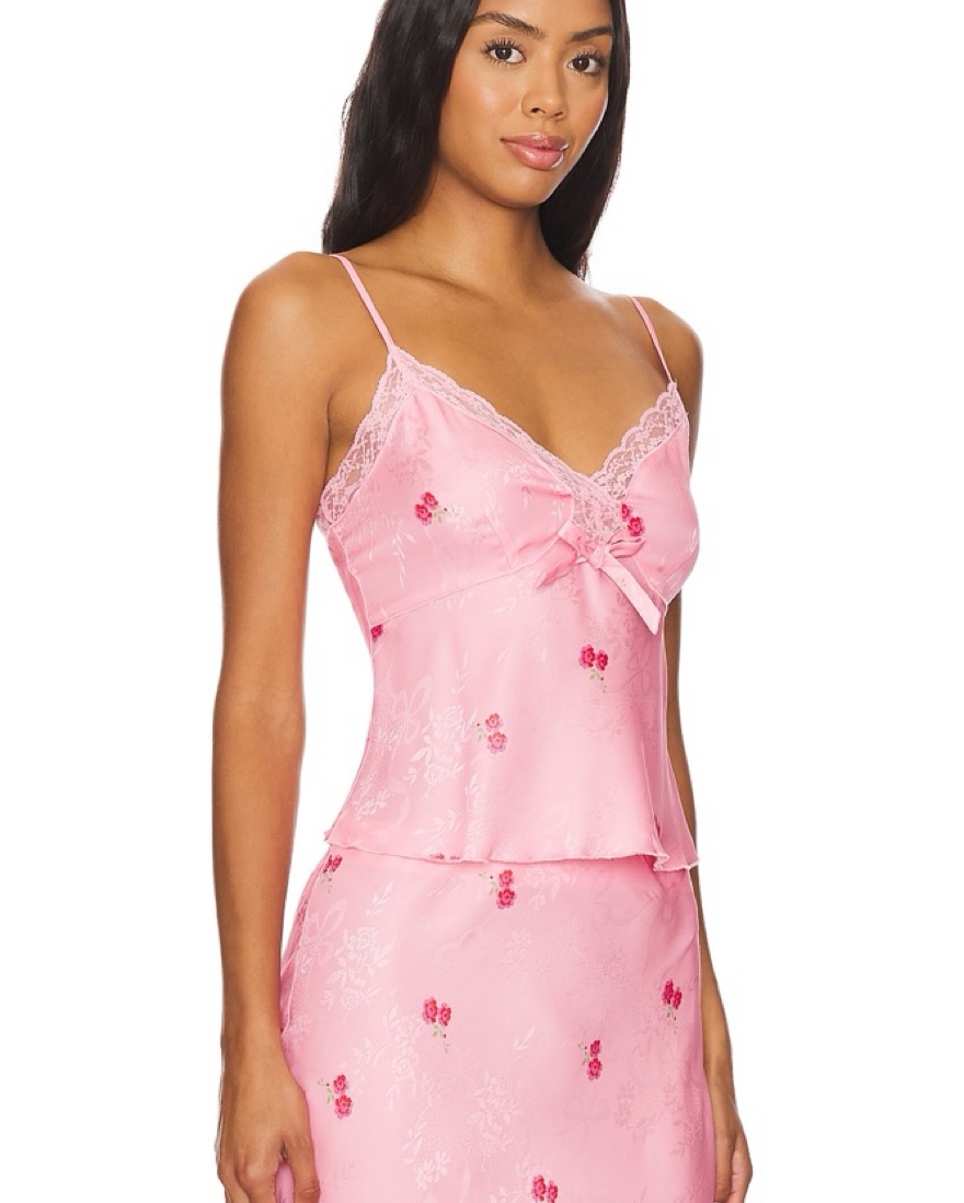 This stunning pink satin set is perfect for a romantic date night or special event. The delicate floral pattern and lace trim add a touch of feminine flair.