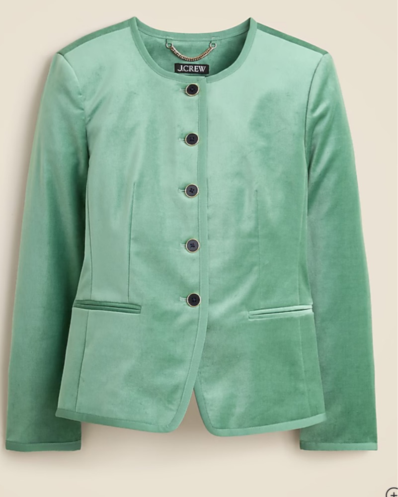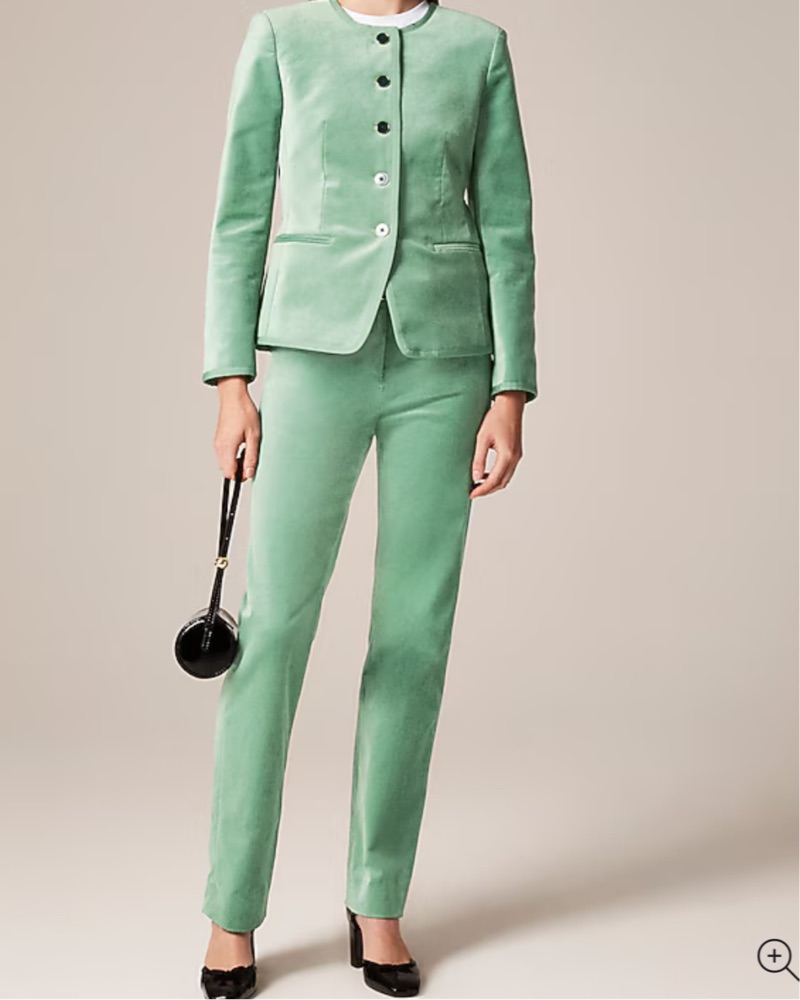 Super chic velvet suit from JCrew. Pants are a 2 and the jacket is a small. color is a blueish/green. super super chic