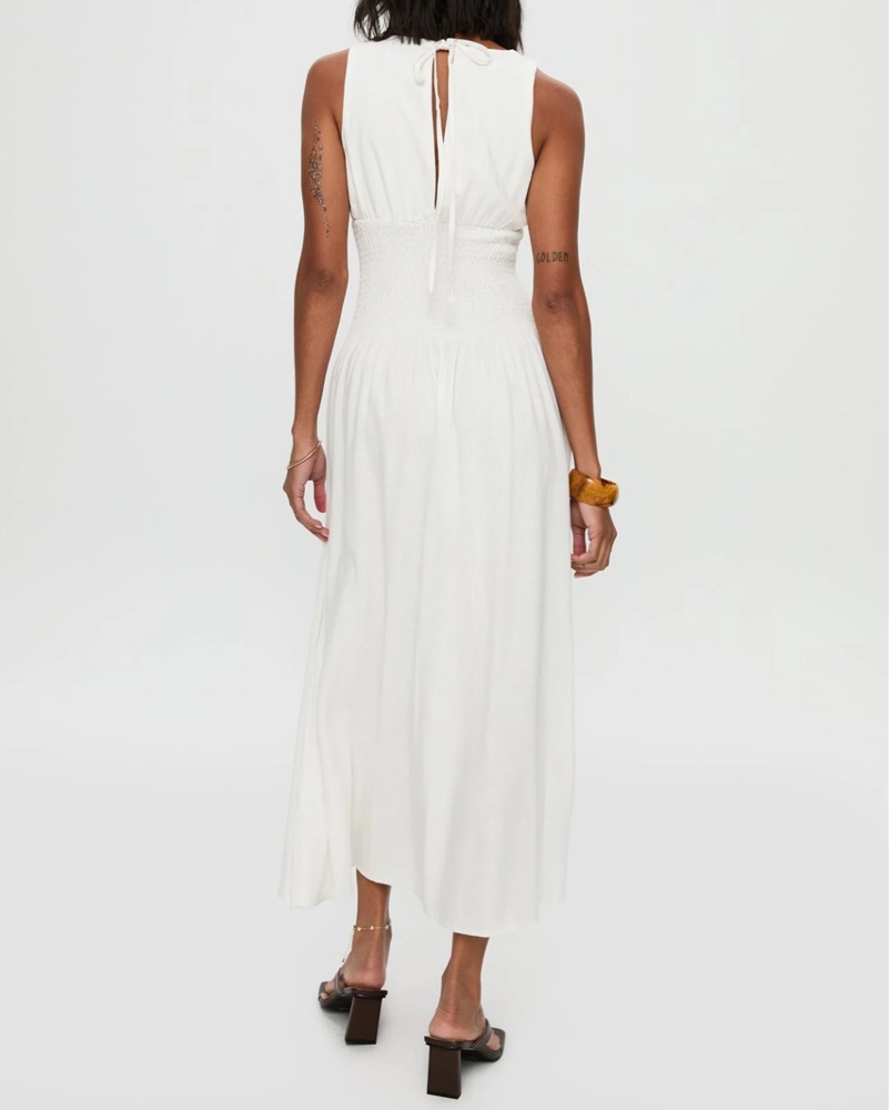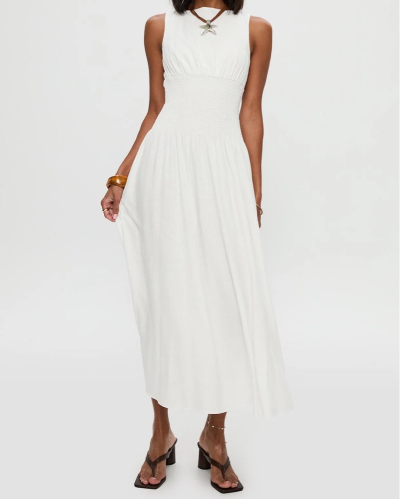 This flowing white maxi dress is perfect for a summer wedding or special event. The lightweight fabric and flattering silhouette create a sophisticated and feminine look.