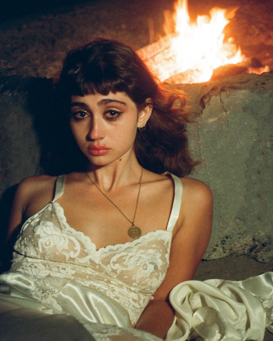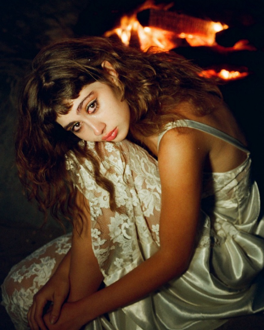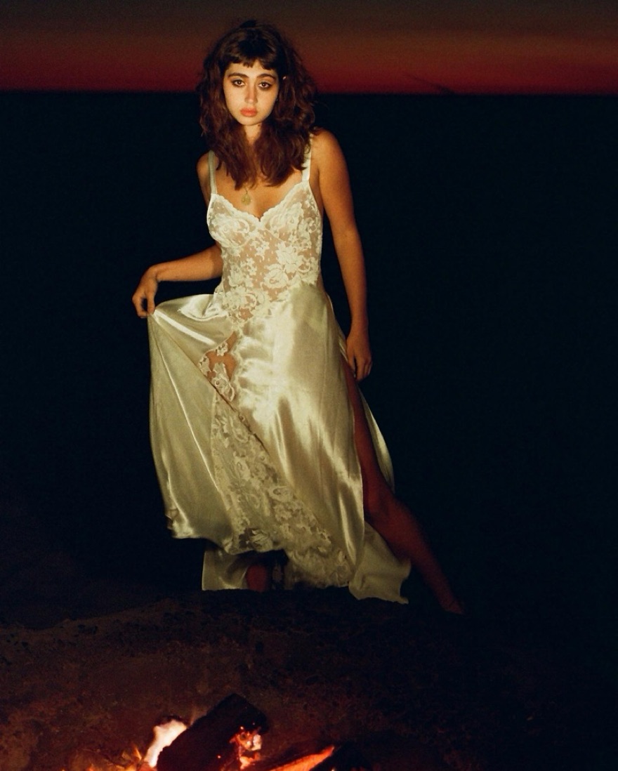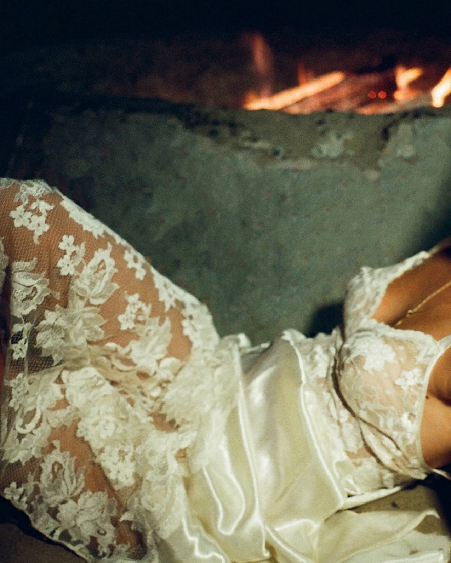 White with white lace detail and open back with ties. Has a leg slit on one side, more white in person than these photos. Top is sheer. Could fit a size XS-small a little loosely to a medium NO SELF TANNER! PS these are my film photos I’m a photographer IG is linked in bio!