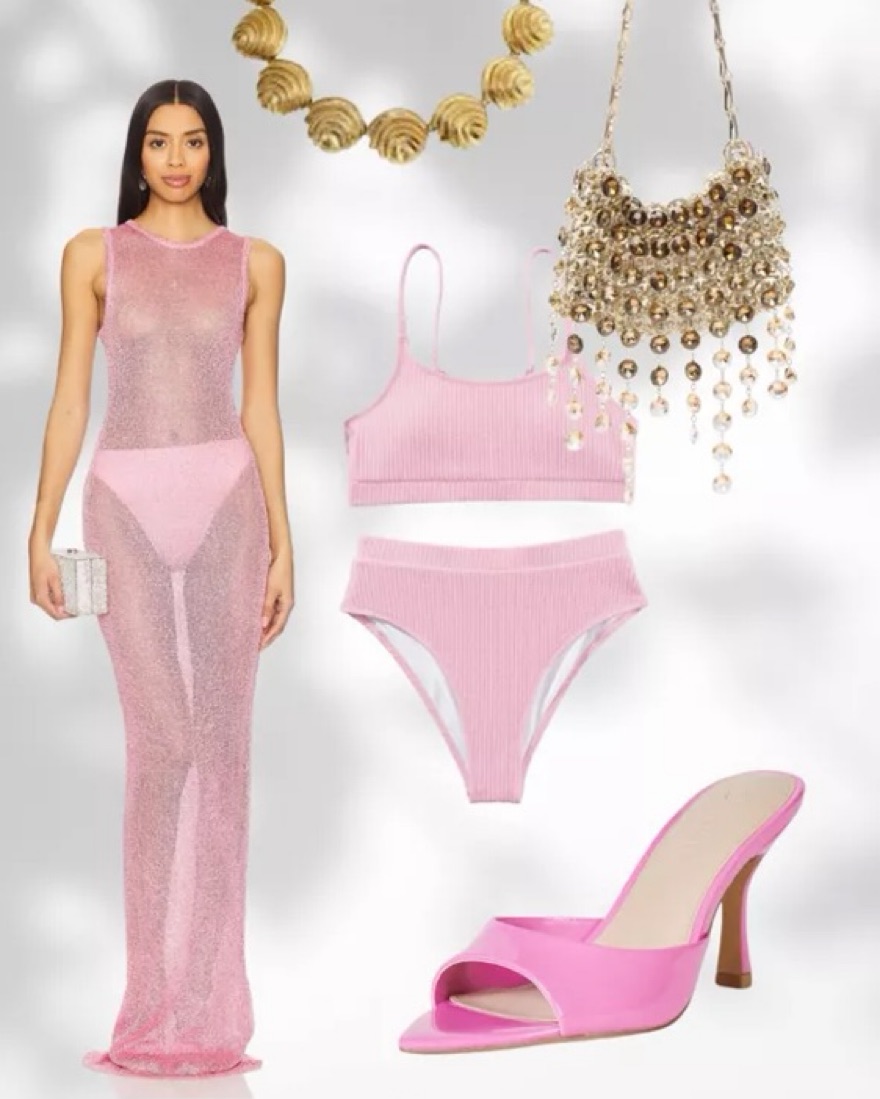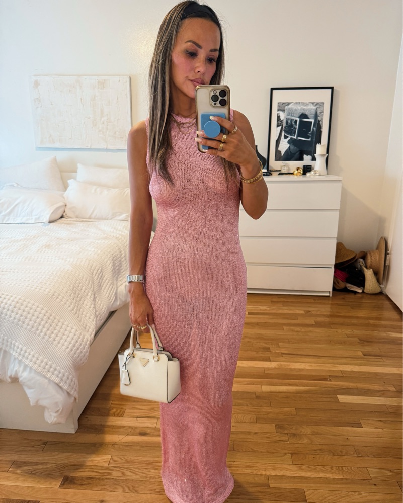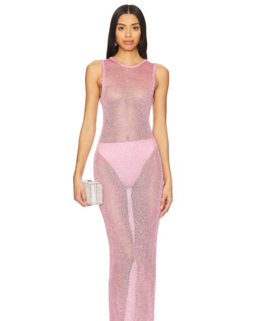Sequin embellished slinky knit fabric. it’s so flattering and very similar to the Asta Resort dress. pairs perfectly with the gold paco rabanne bag which i also have available. material snags easily so please be careful with herđŸ’–vacation, summer, europe, pink, birthday, night out, date night