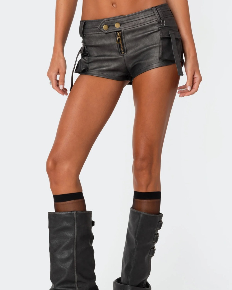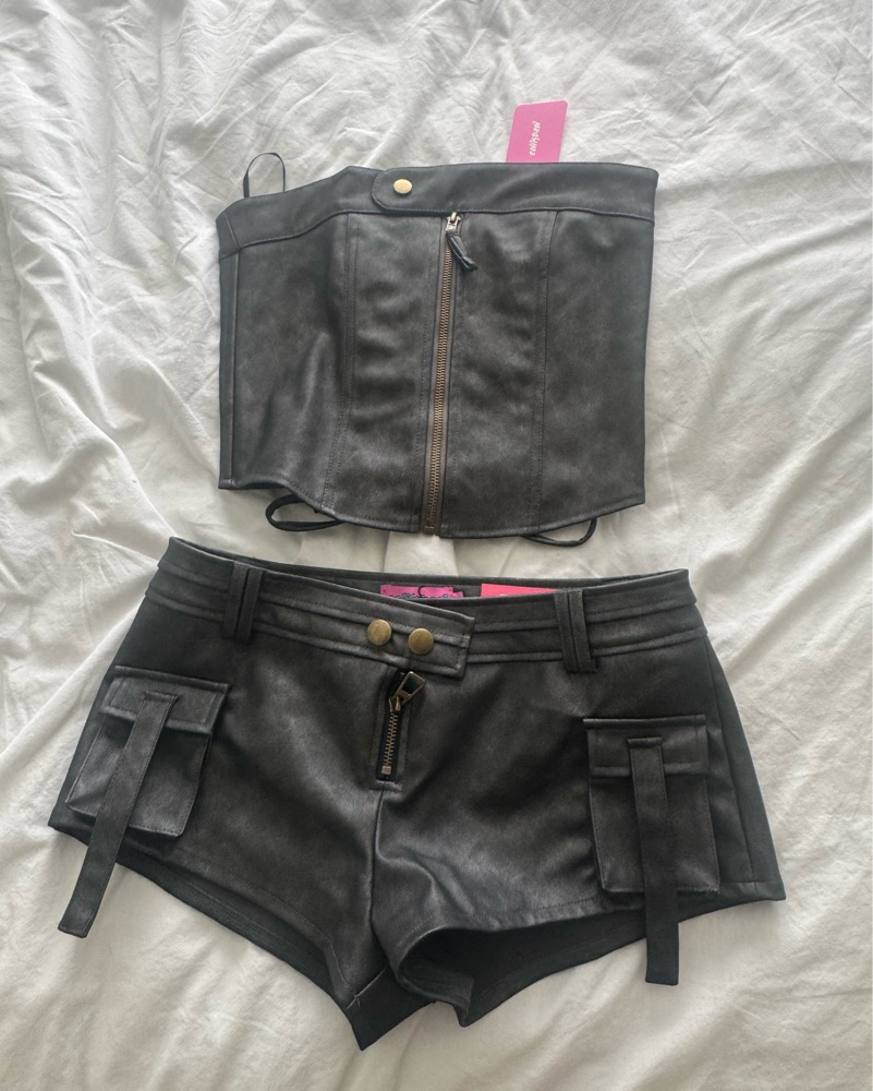 Edikted Leather Shorts and Tube Top Set in washed black. The shorts are size M (but fit like S) and the top is size S with adjustable corset back.
