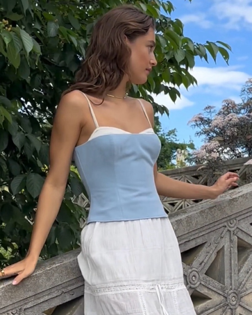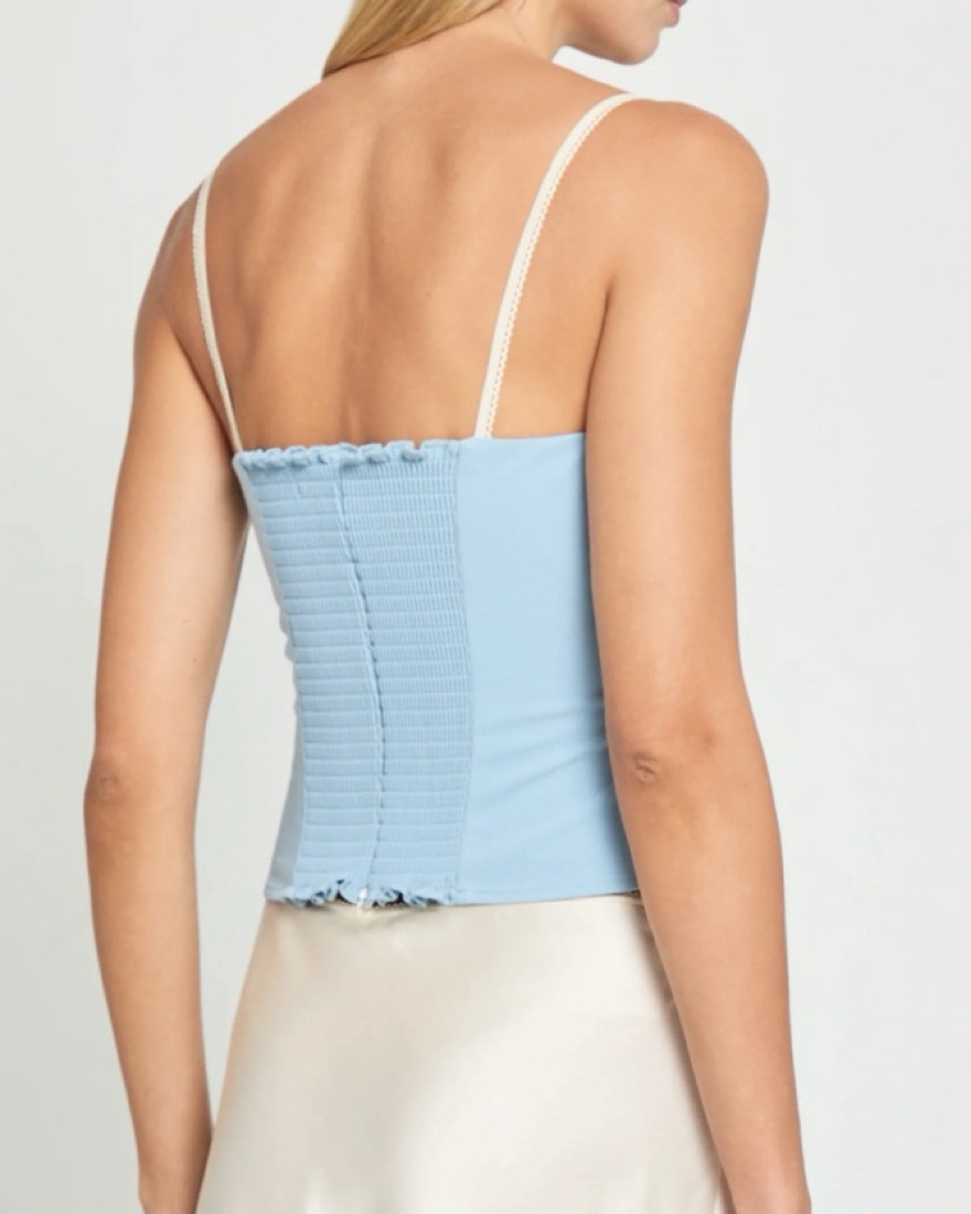 Cutest built in bra style contrasting color tank top. So fun with jeans or white pants or skirt. Extremely flattering looks better on than the model pics. Baby blue!! Looks like a reformation top