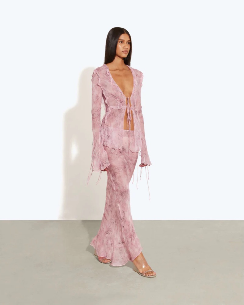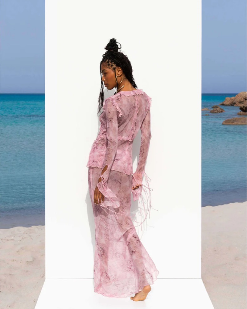 This pink sheer set is perfect for a tropical getaway or a beachside event. The flowing, sheer fabric and delicate details create a truly romantic look.