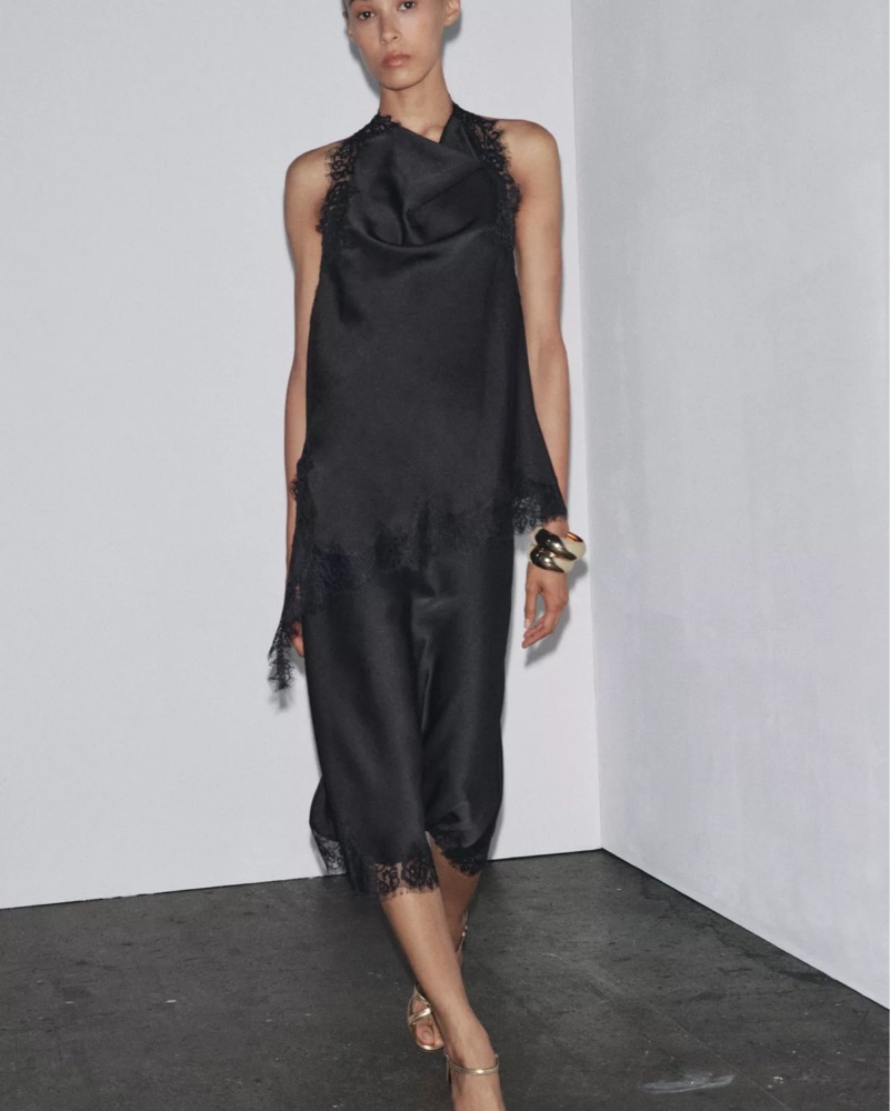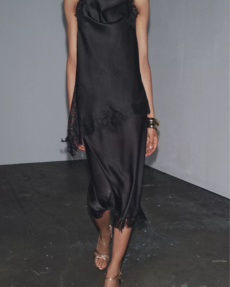 Zara satin effect lace midi skirt. Also have the matching top (not the top shown here) listed and the matching set avail to rent as well.