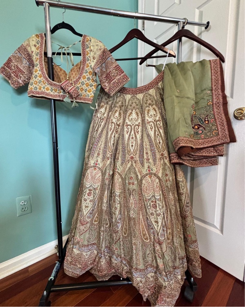 Beautiful embroidered silk lehenga in pastel green and beige. Intricate design. Size S. Measurements below: shoulder: 14.5”, waist 30”, bust 33.5”, armhole 16.5”