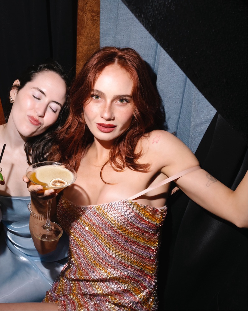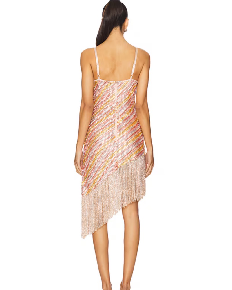 Sparkly beaded mini dress with a diagonal crystal pattern in warm gold, pink, and champagne tones. Slim, strappy silhouette with a dramatic hand-beaded fringe hem