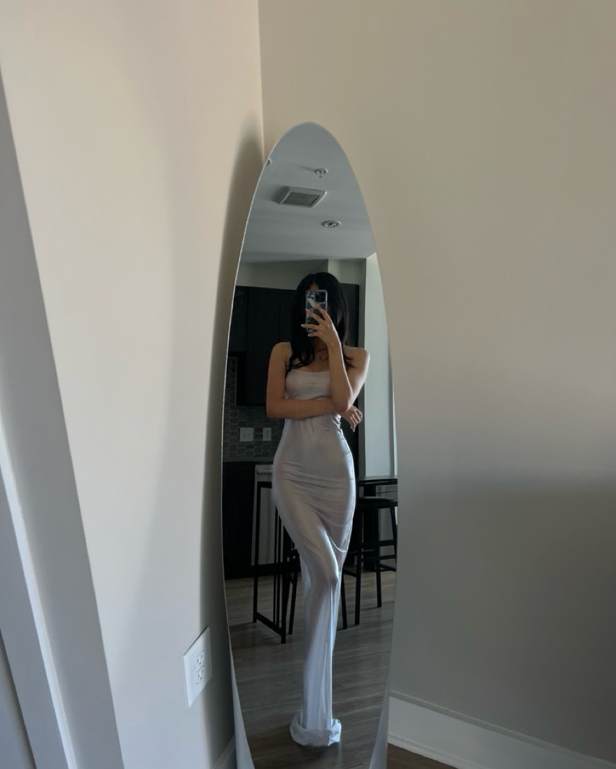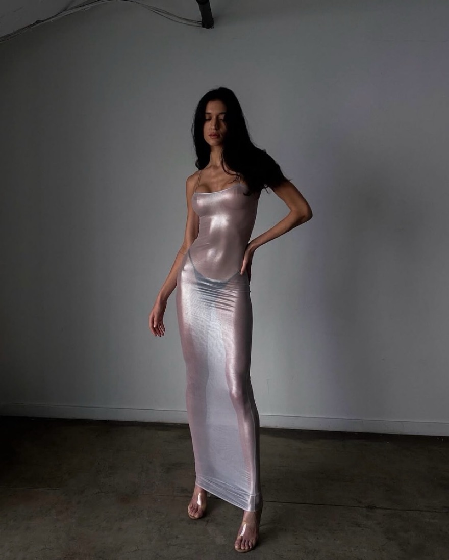 Unavailable atm :( Sheer, metallic floor-length slip dress with a slight scoop neckline and thin self-fabric straps. V Kate moss vibes! Hand wash only. It’s more of a pearl color but I marked it as silver for exposure. I’m 5’2/XXS and the second pic is how long the dress is on me for reference