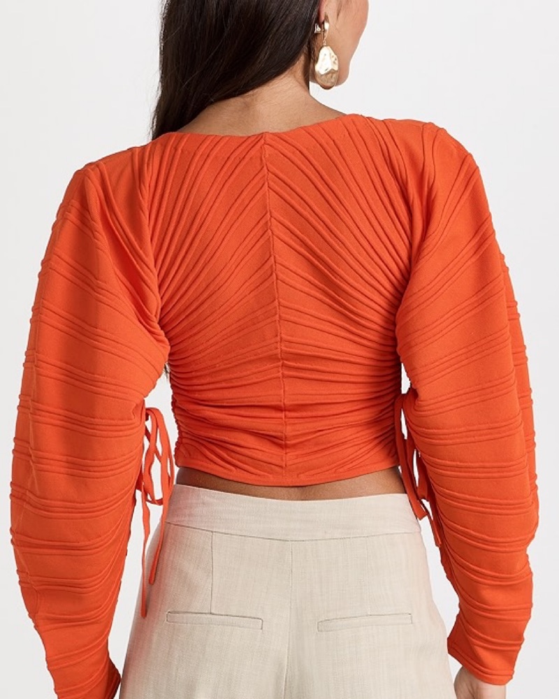 This orange cardigan top features a ruched design and billowing sleeves that provide amazing contrast. It’s slightly cropped and best worn without anything underneath! Size S but runs small so listing as XS!