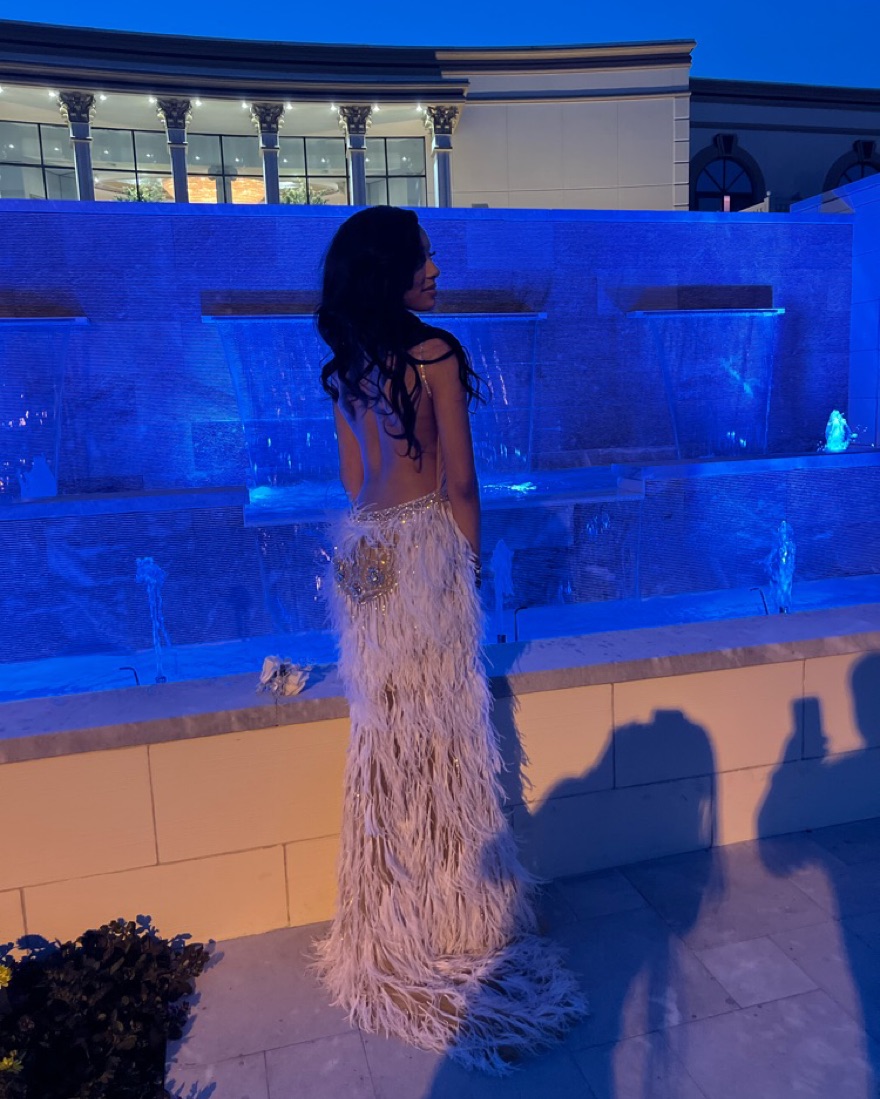 Dress is a size 4. Backless with feathers. Completely embellished! Dress is absolutely gorgeous!