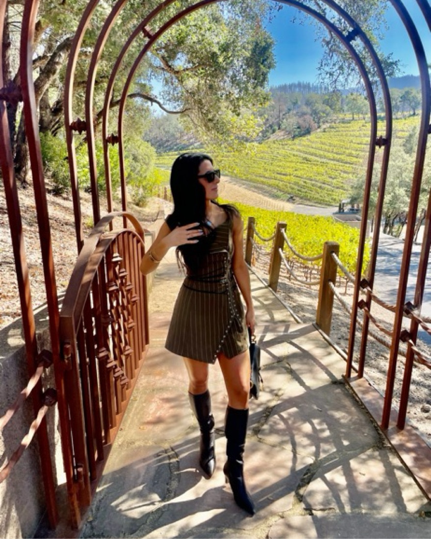 Color: olive pinstripe, had the dress hemmed at the bottom (i am 5’5), you can wear it on or off the shoulder
