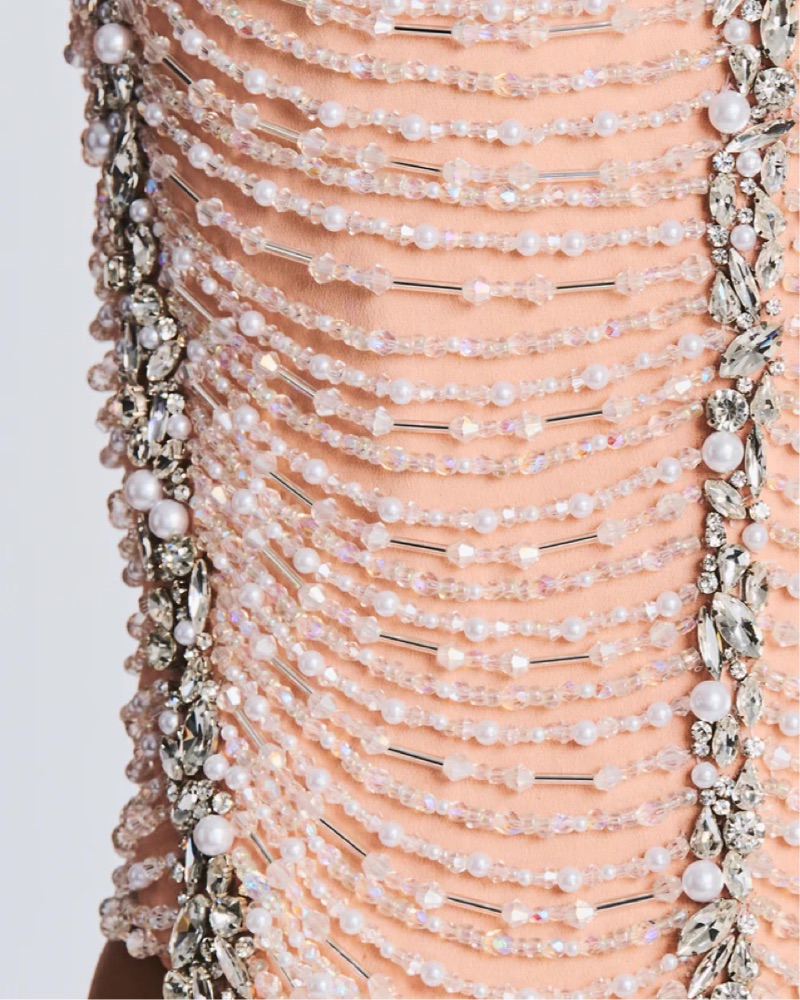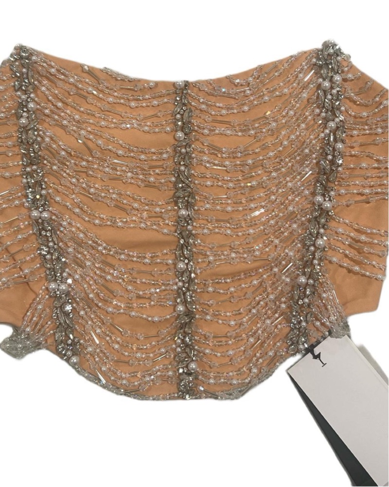 This stunning peach crop top is adorned with intricate beading and sequins, perfect for a glamorous night out.