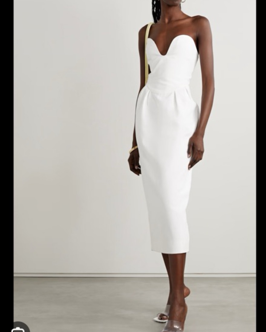 White strapless midi dress with deep sweetheart neckline, boning at the side, and curved waist seam.