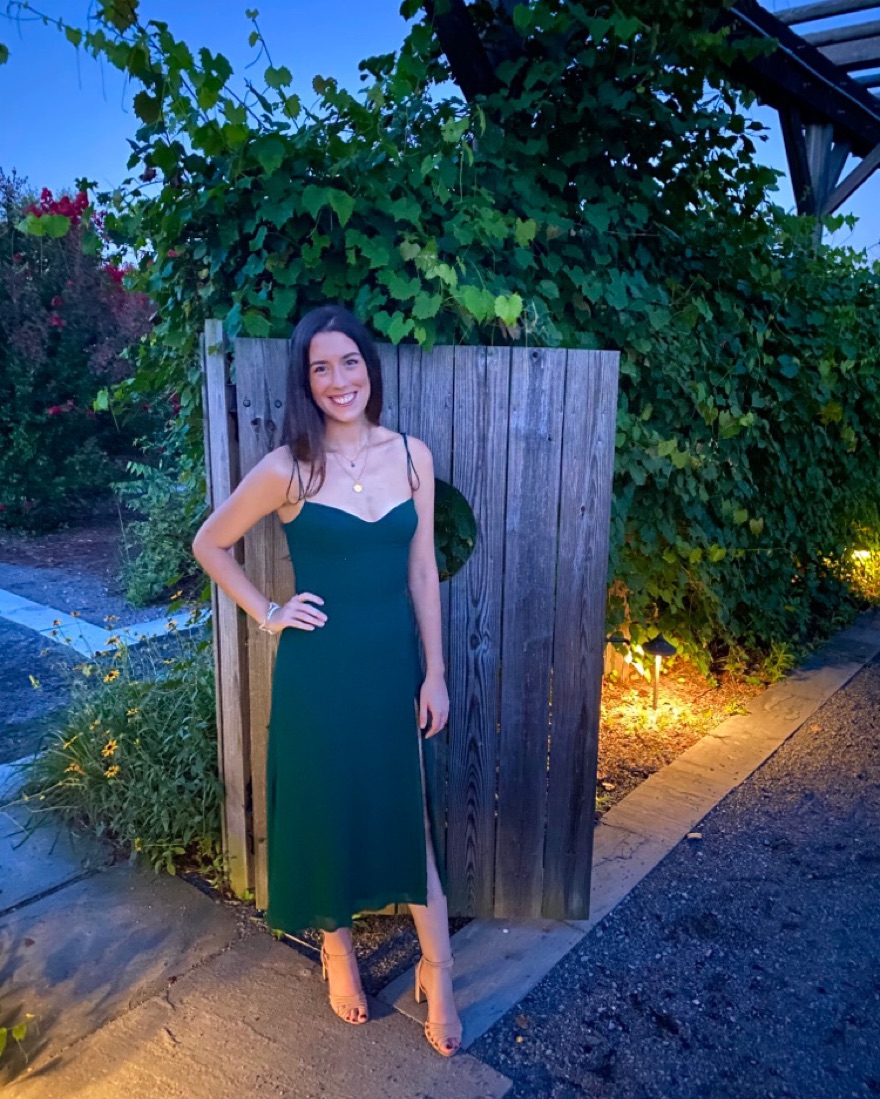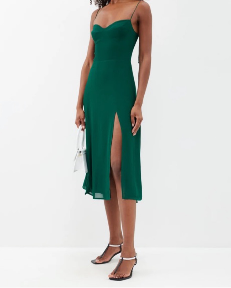 Reformation juliette dress in green. High slit, very flattering. For reference, I’m 5’8”, 130 lbs, B cup.