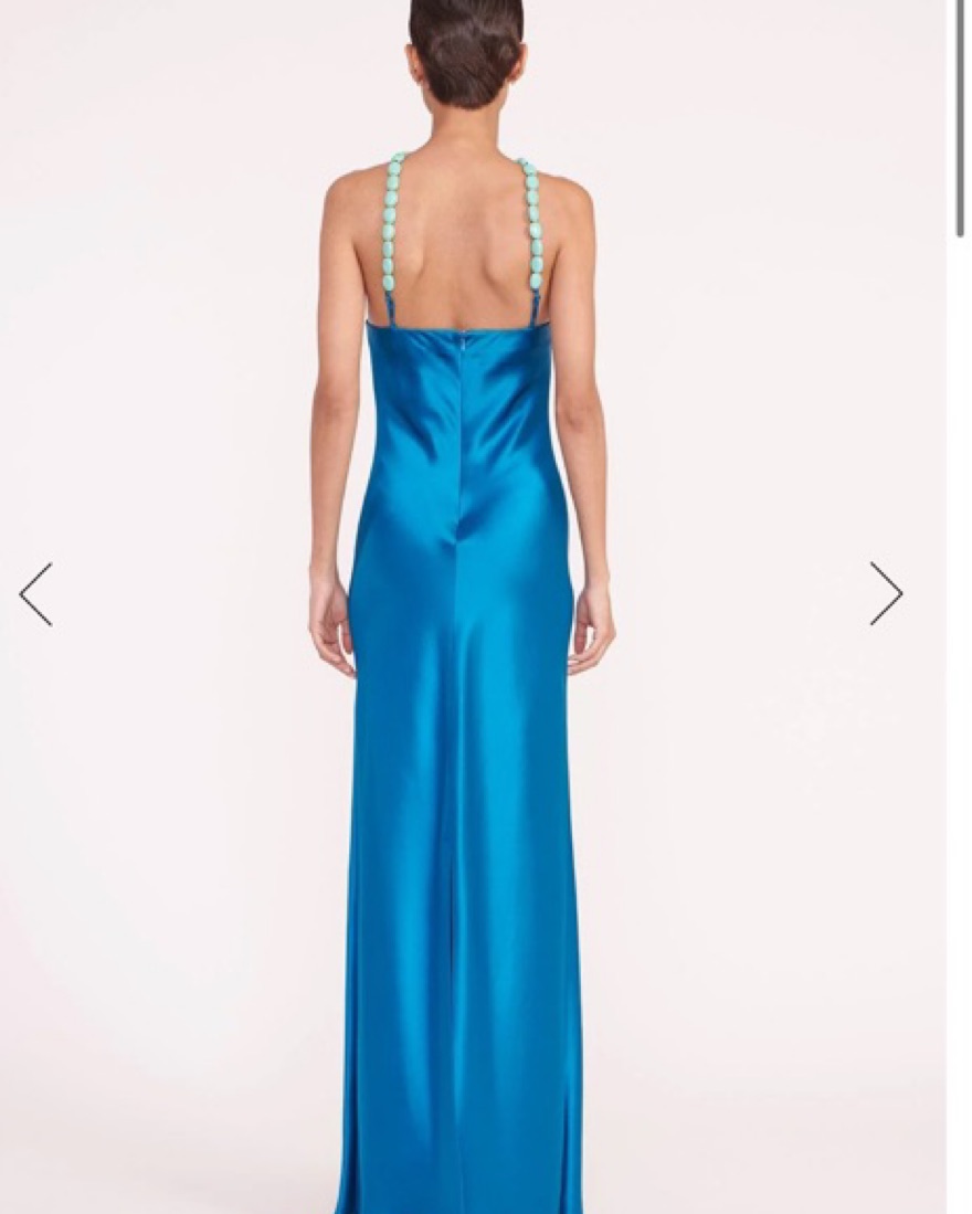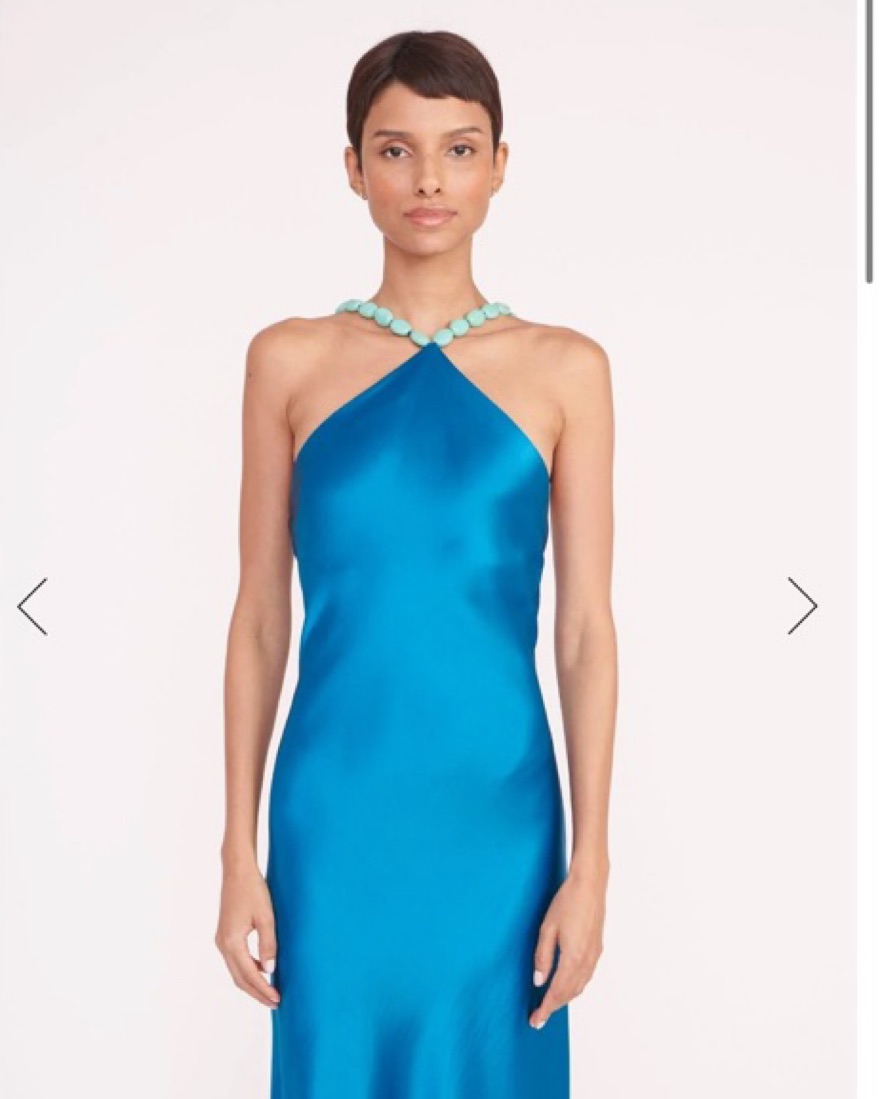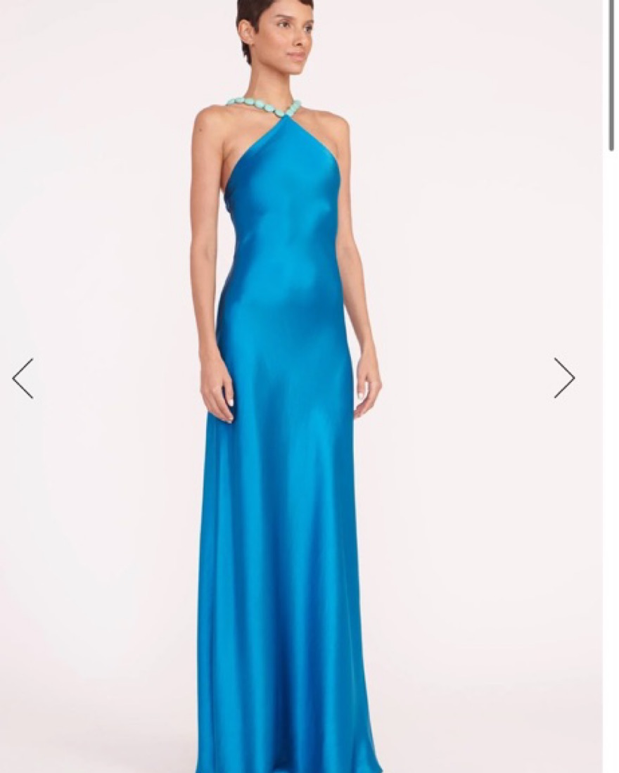 The most stunning Staud gown in absolutely perfect condition. The Cadence Dress is a new slip dress silhouette for Summer, featuring a halter neckline with beaded straps. The dress is crafted in satin and has a hidden back zipper. Got SO many compliments when I wore this to a wedding!