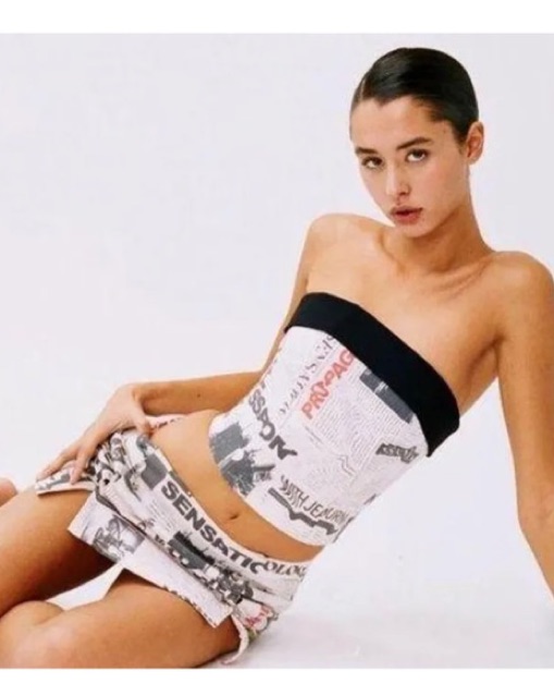 Fits a little smaller than my other XS with Jean pieces; prob fits XXS/XS. Last pic is the exact top / print placement. With Jean Carla corset in print read all about it. Zipper closure. Boning in. Fully lined. Structured shape.