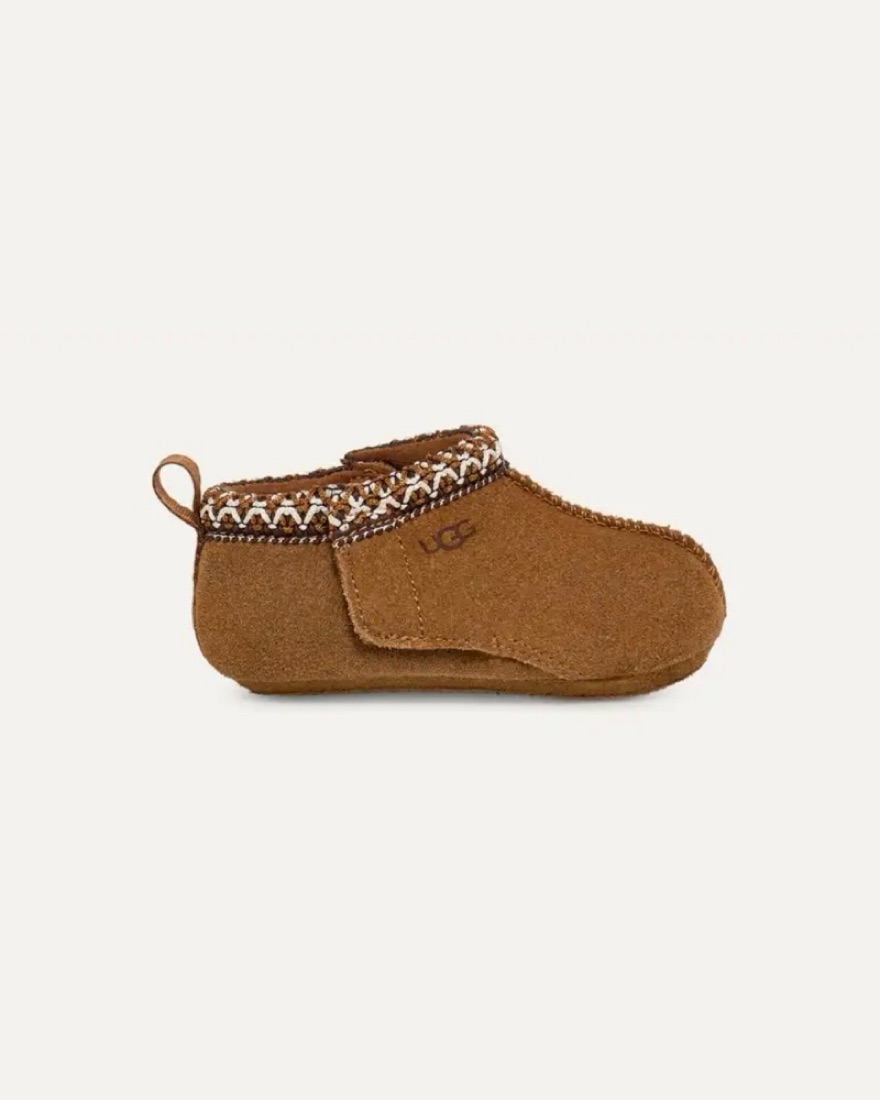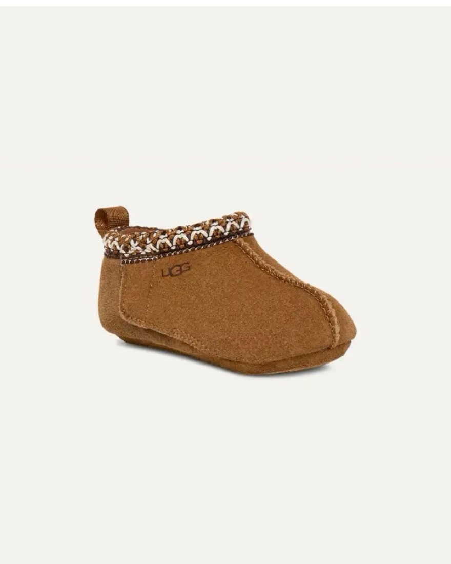 SIZE 12-18 months (04/05 M). CHESTNUT. Crafted from rich suede with a kid-friendly hook-and-loop closure, paired with a matching beanie.
