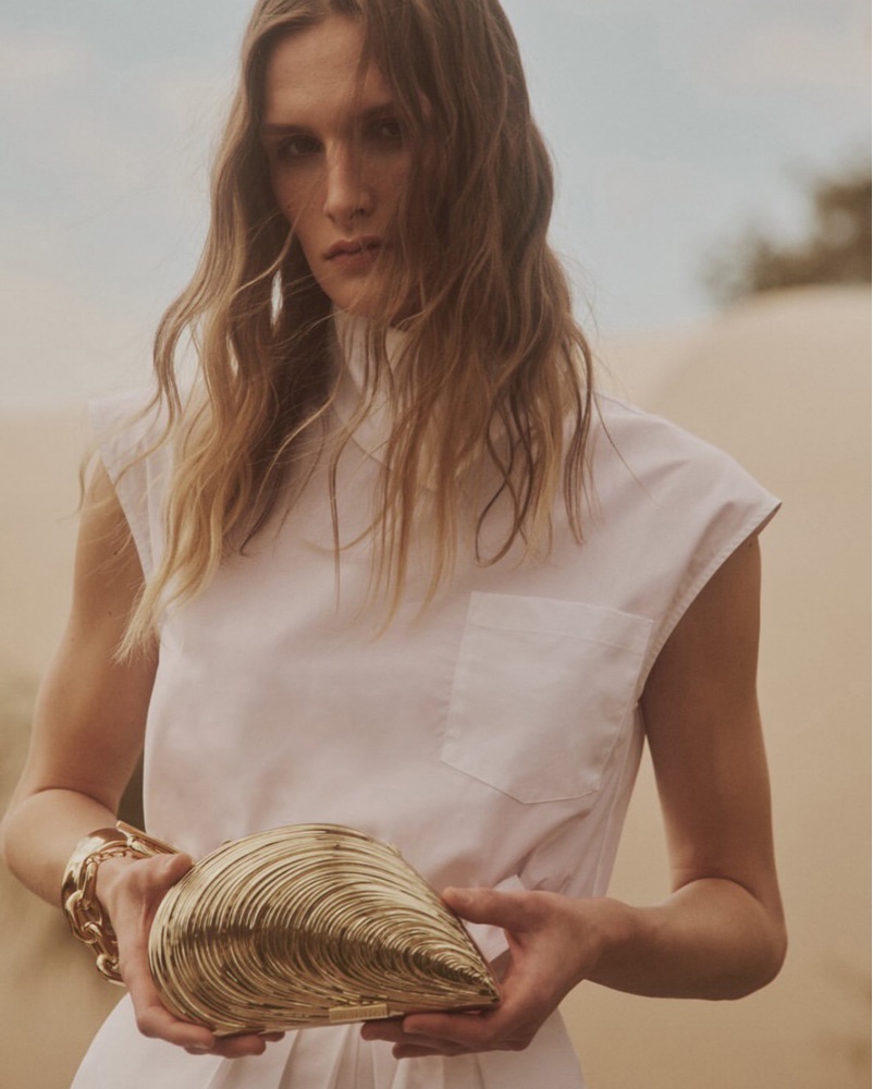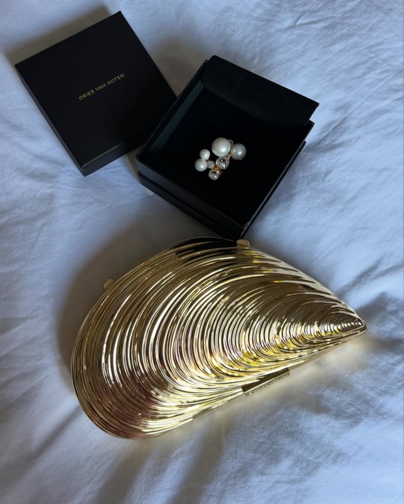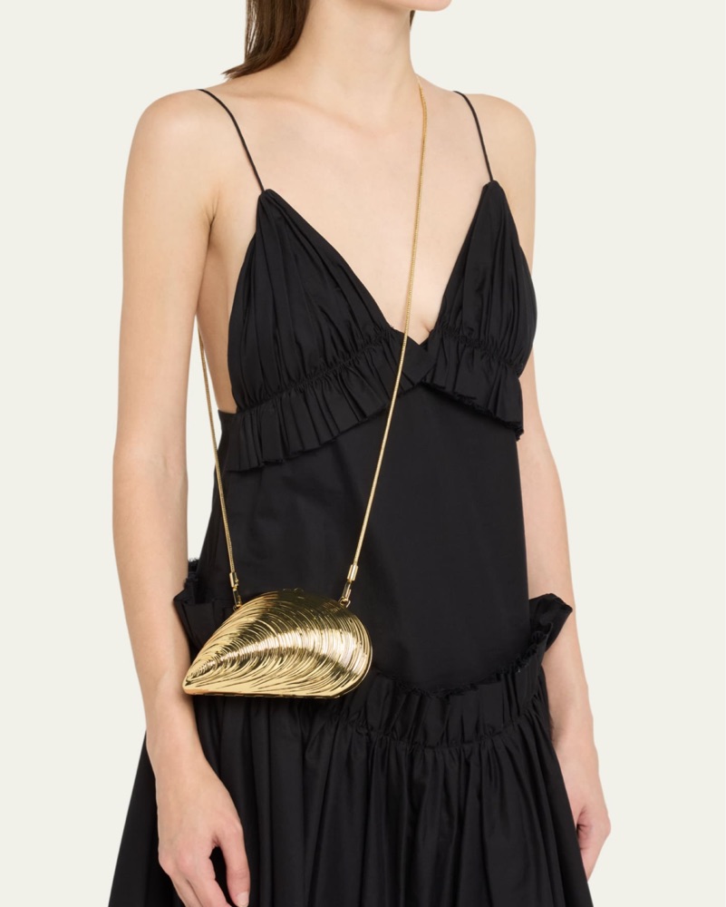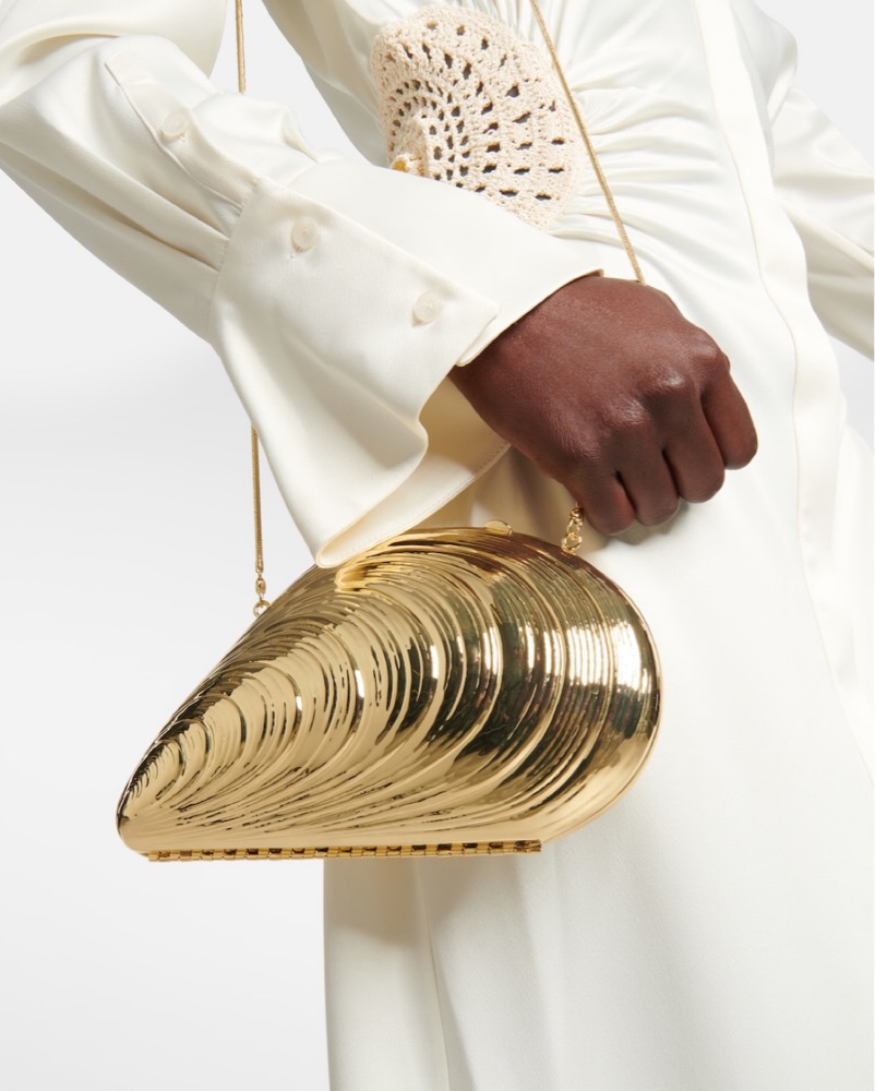 A sculptural hard-shell clutch inspired by the sea, featuring a radiant gold oyster shell design. Finished with a magnetic closure, lined interior, and removable chain strap.