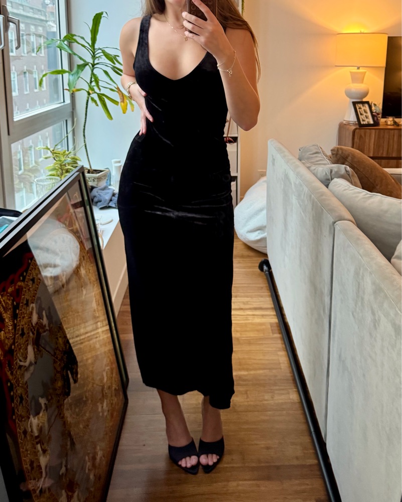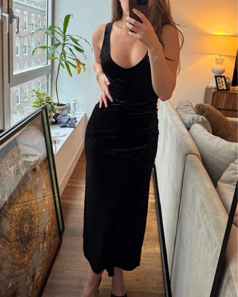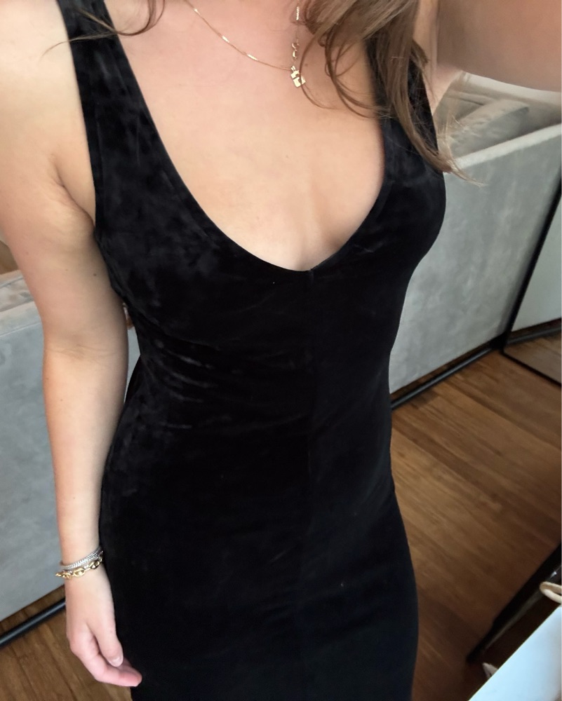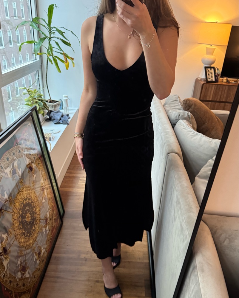 Insanely flattering stretchy figure hugging black velvet dress reversible (one side boat neck other side v neck) insane for formal events, galas, gatherings, Halloween, like it’s so cool and unique 10/10. Side slit on side - fits XS- M NYFW vibes