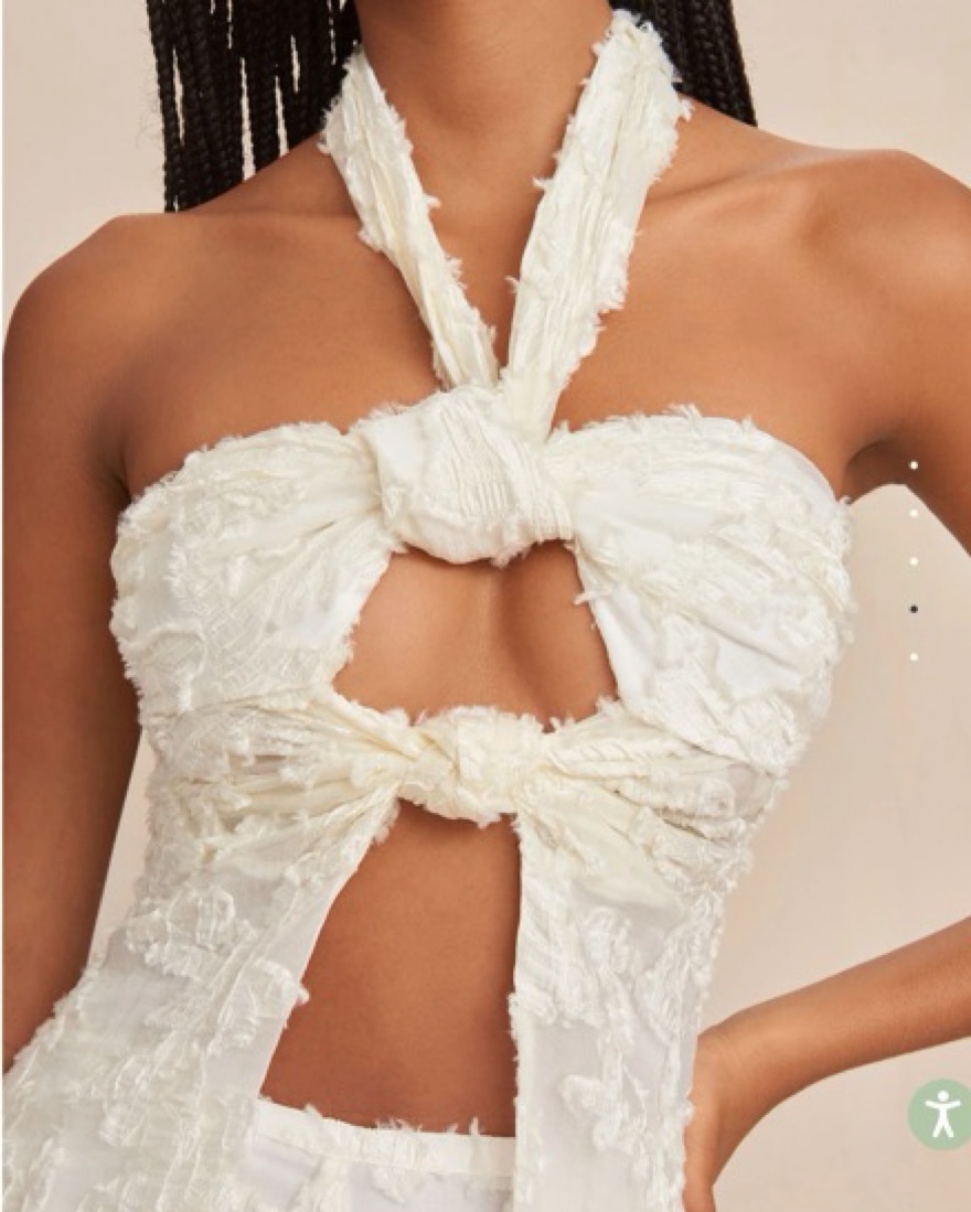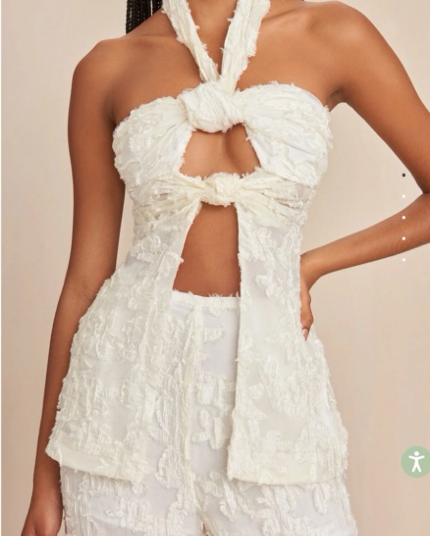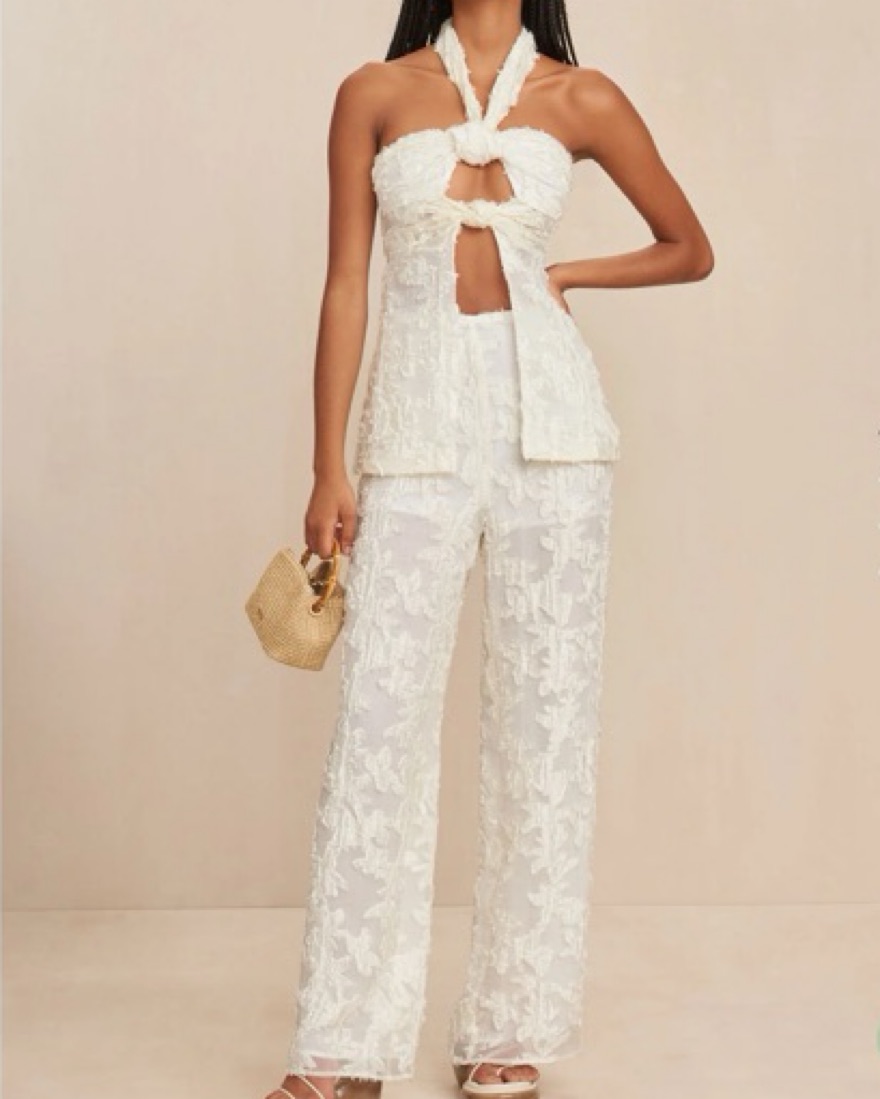Cult Gaia matching set in Off-White. LAINE Top+ Pant. Absolutely stunning. Size Small halter top with cutouts made from knotting at the neck + bust, in a flowy, textured fabric that drapes body. Can tie the neck knot to adjust fit! Size 2, wide leg, high-waisted pants. Bridal or beach vacation fit!