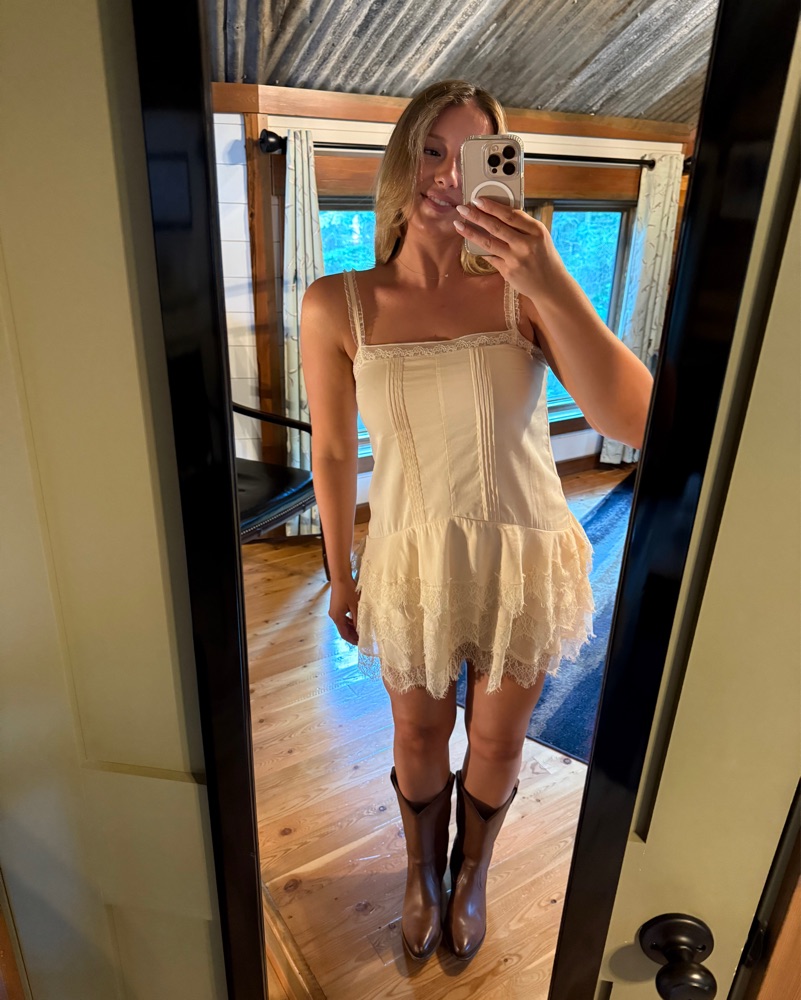 Sold out!! This dress is so cute and flattering.ace detail and drop waste. The color is a true cream/off white. Designed to have a relaxed fit throughout. This item runs large. We recommend sizing down.