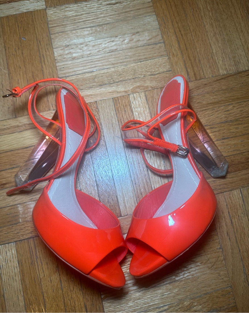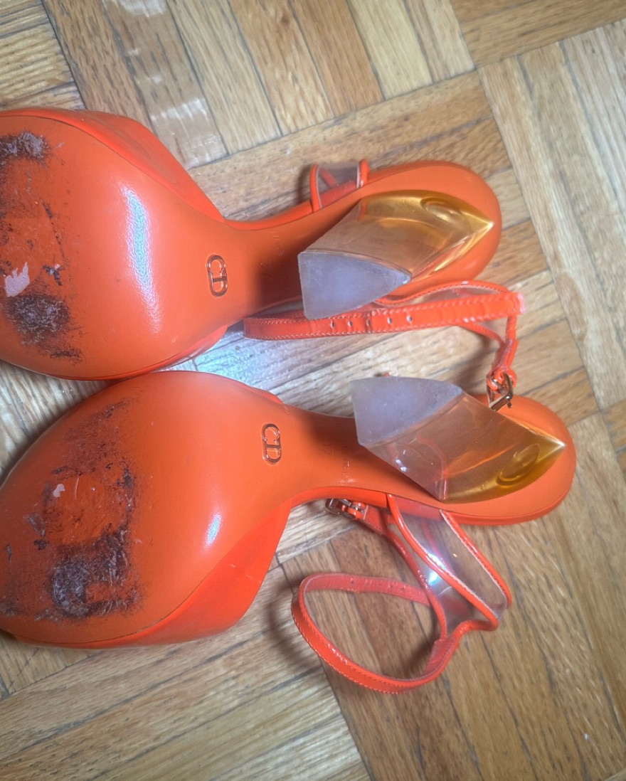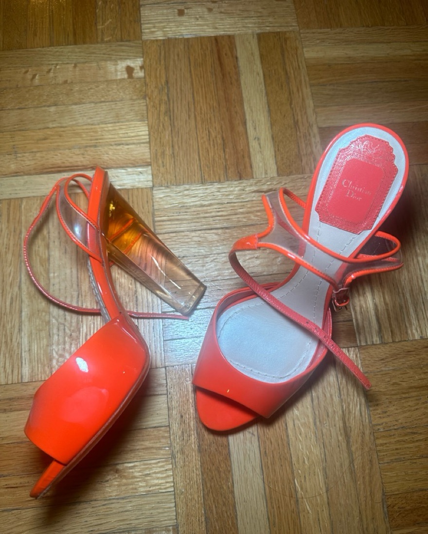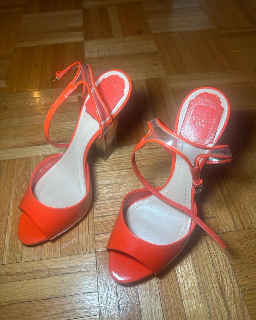 Vintage christian dior heels in a true size 7. Some flexibilty for a 7.5 but might be a bit uncomfortable to stand in for too long! There is an adjustable strap