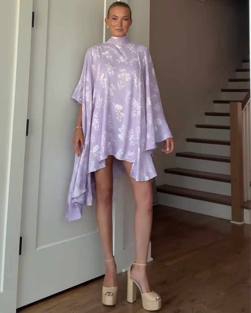 BHLDN MARIA LONG-SLEEVE HIGH-NECK SWING MINI DRESS. This beautiful lavender wrap dress with delicate floral print is perfect for a spring garden party or romantic dinner date. The flowy, flowing silhouette and oversized sleeve details create a beautiful, feminine look.