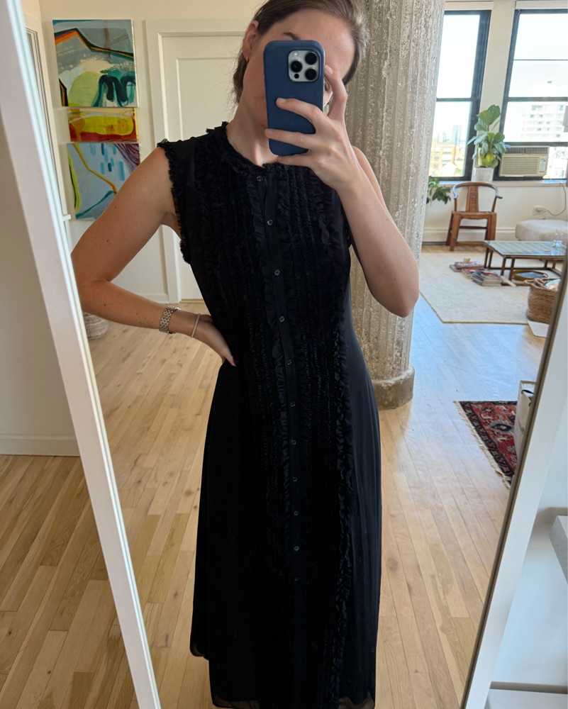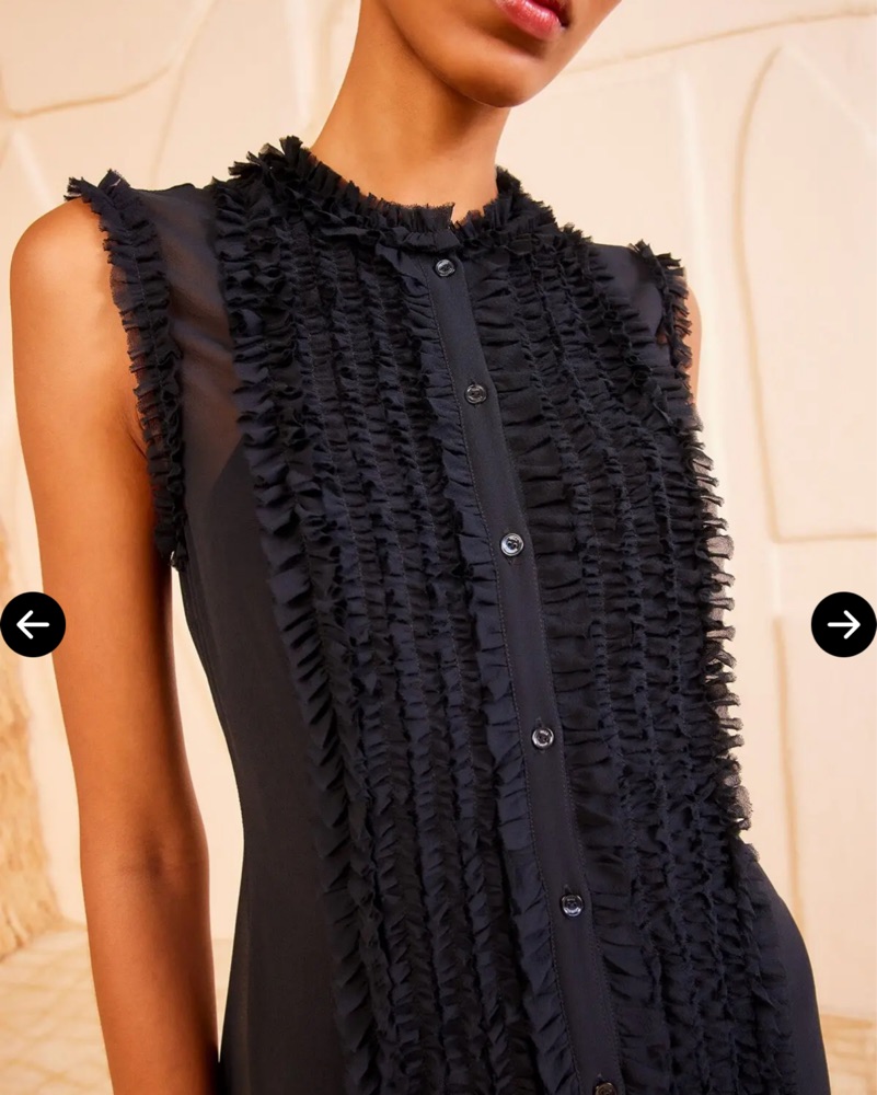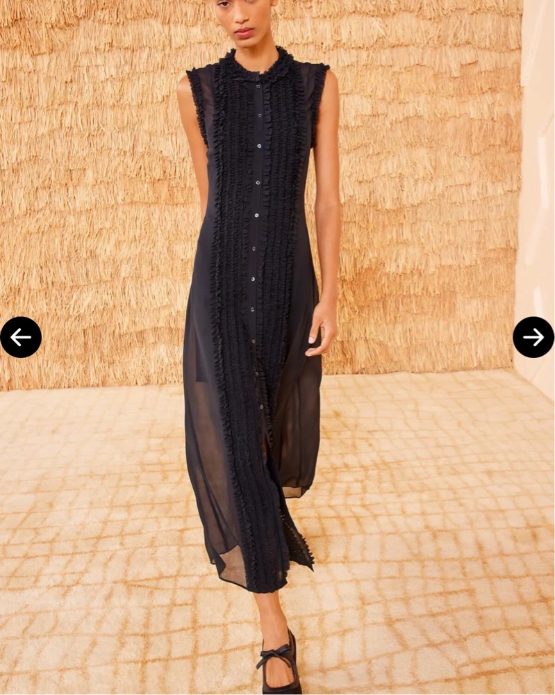 The Ulla Johnson Claudine Dress is crafted from 100% silk georgette. This sleeveless dress features a round neck, is lined, and has a button-up closure. It is accented with raw-edge ruffles.