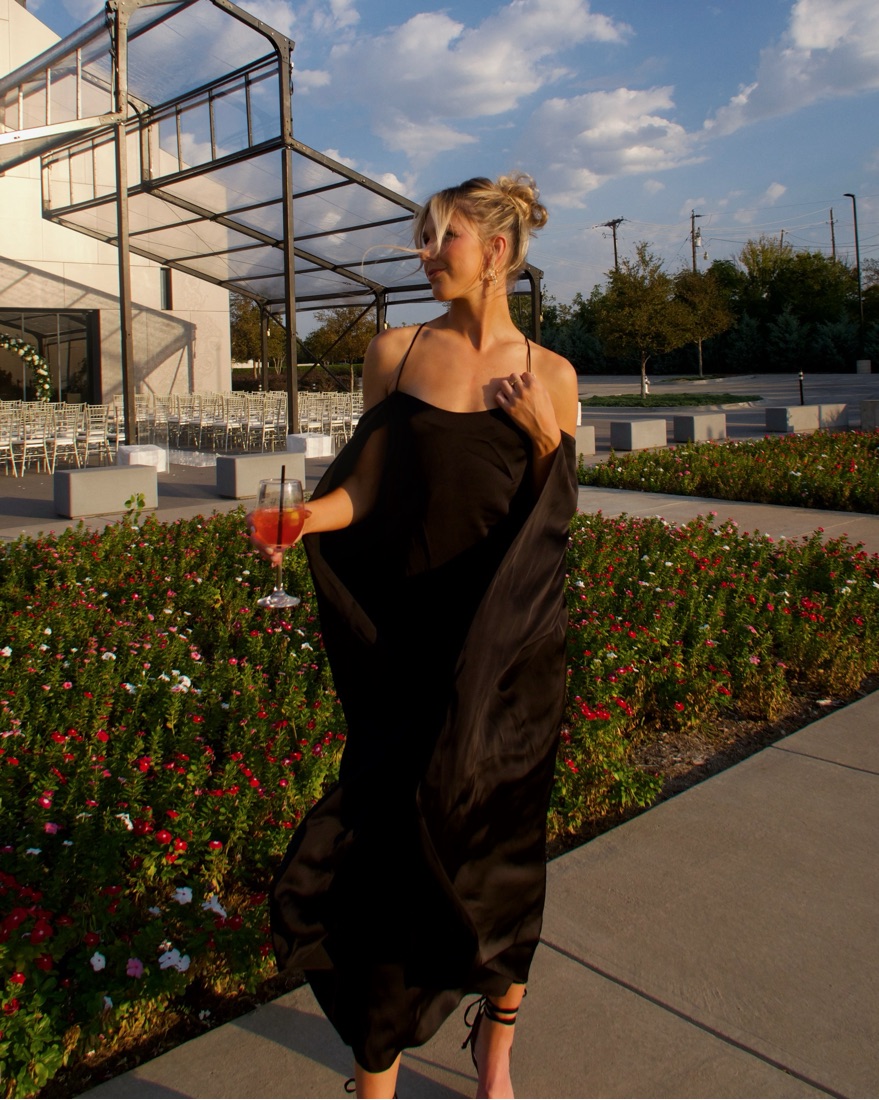 Size small — worn once to a black tie wedding — super chic — tie back — I am 6 feet tall so it will be longer on shorter girls