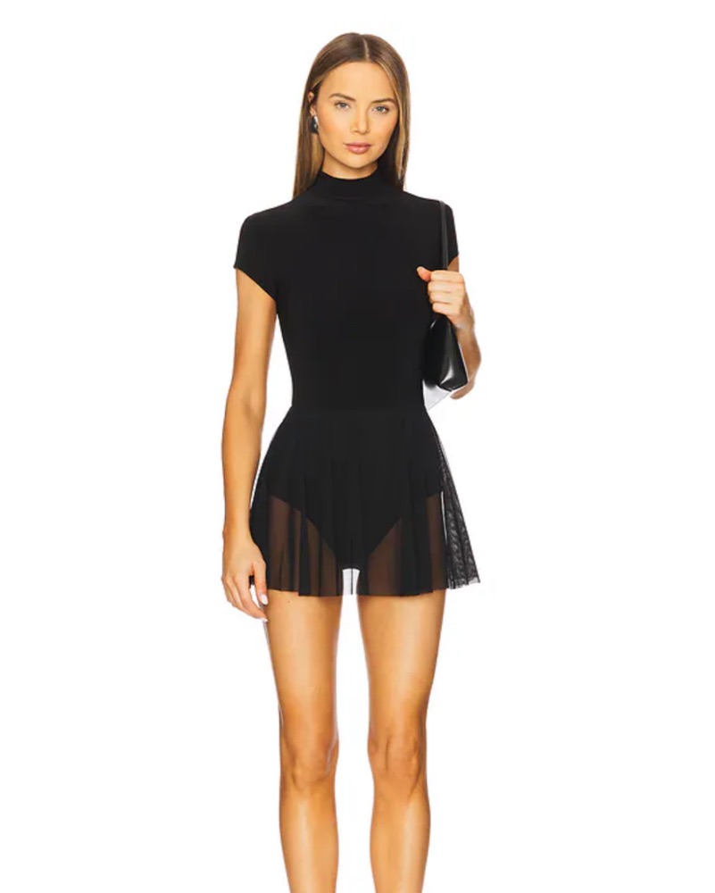 Such a flattering dress! Black mock neck dress with see through bottom. So comfortable and such a fun dress.