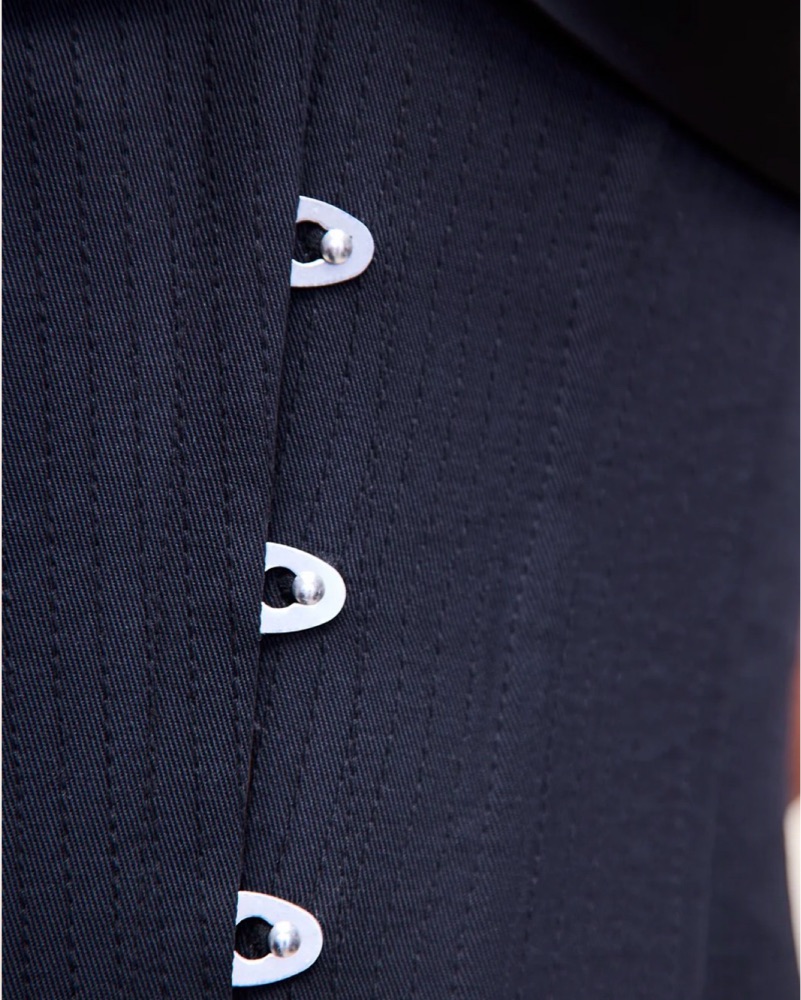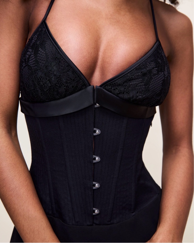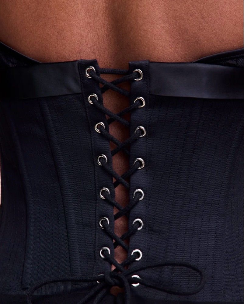 The Marini Corset Dress features the iconic lace corset bodice, paired with a fluid, sheer skirt for a dramatic high-low finish. Designed with delicate straps, hook-and-eye corset detailing, and a cinched waist.