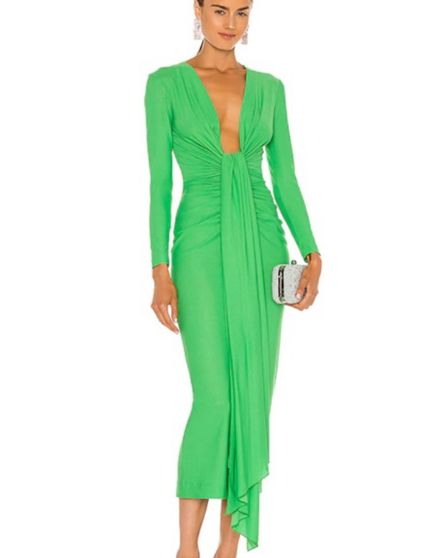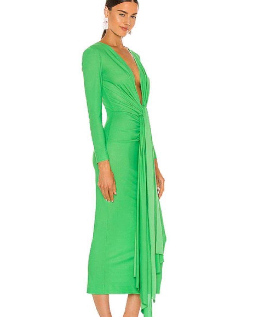 Lorena green midi dress. This vibrant green midi dress is perfect for a special occasion. The ruched detailing creates a flattering silhouette.
