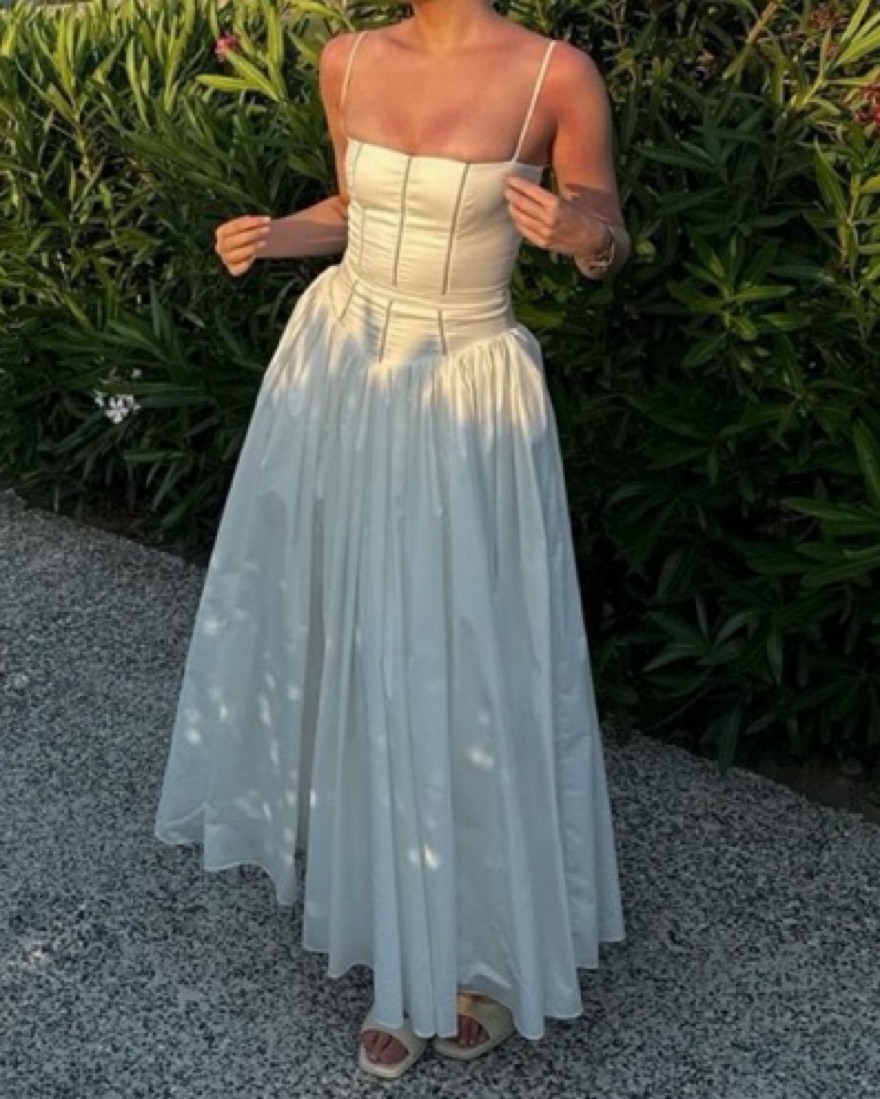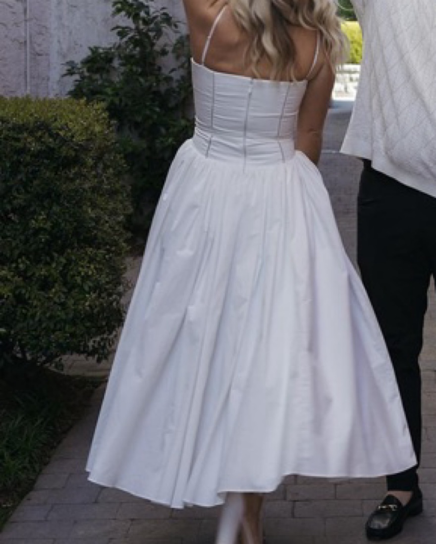 This stunning white dress is perfect for a formal occasion. The structured bodice and flowing skirt create a sophisticated and elegant silhouette.