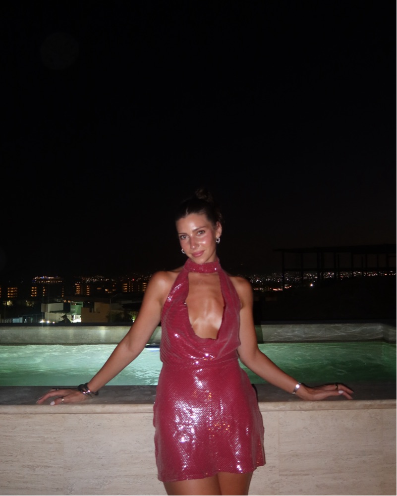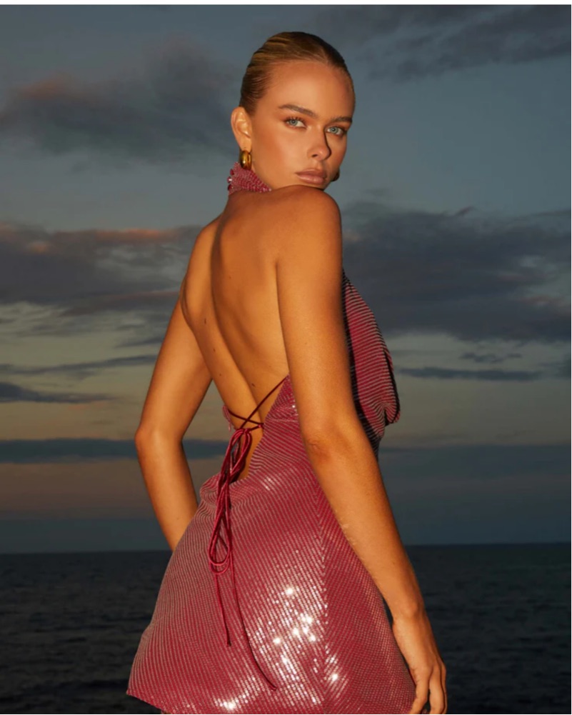 Worn once! For reference I am 5’10” and it still covers everything. Turn heads in the Nora Sequin Cowl Neck Mini Dress. Featuring a dramatic low front cowl neckline and a sultry backless design, this mini dress is perfect for making a statement. The side invisible zipper ensures a seamless fit.