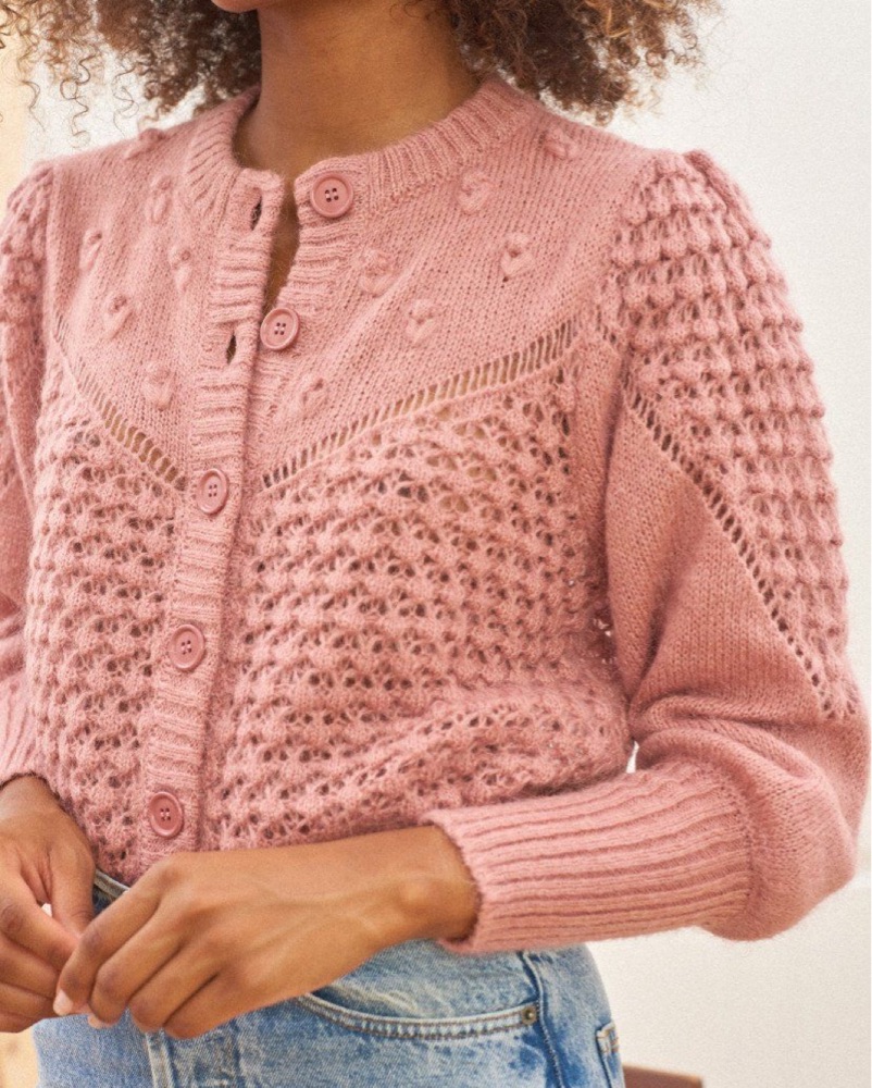 This gorgeous knit cardigan is perfect for adding a touch of warmth and style to your casual outfits. The intricate details and puff sleeves make it a standout piece.