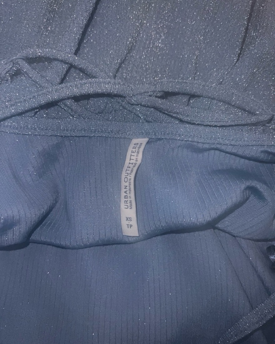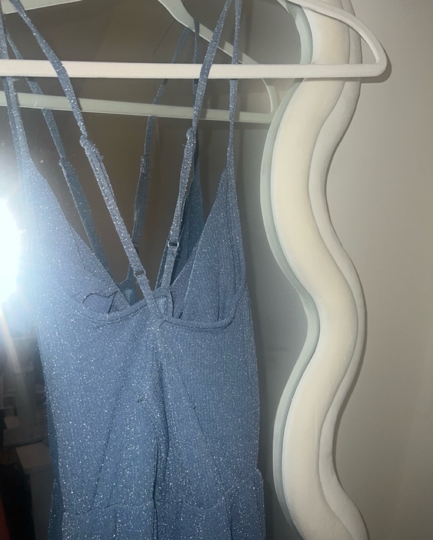 This super cute light blue jump suit is so comfortable and the sparkle is so fun :) could slay day or night time! Defined-waist silhouette topped with a cowl neck and adjustable straps. Size : XS