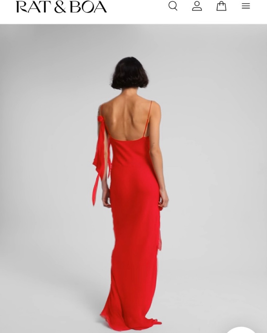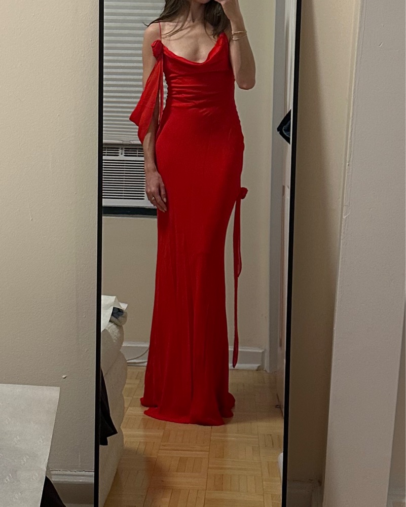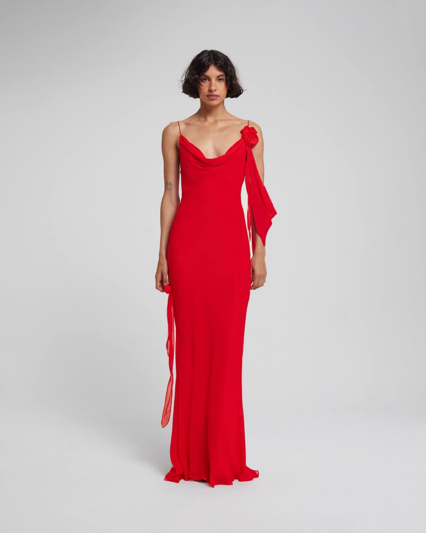 Satin dress perfect for a glamorous evening event with vibrant red color and an elegant draped silhouette