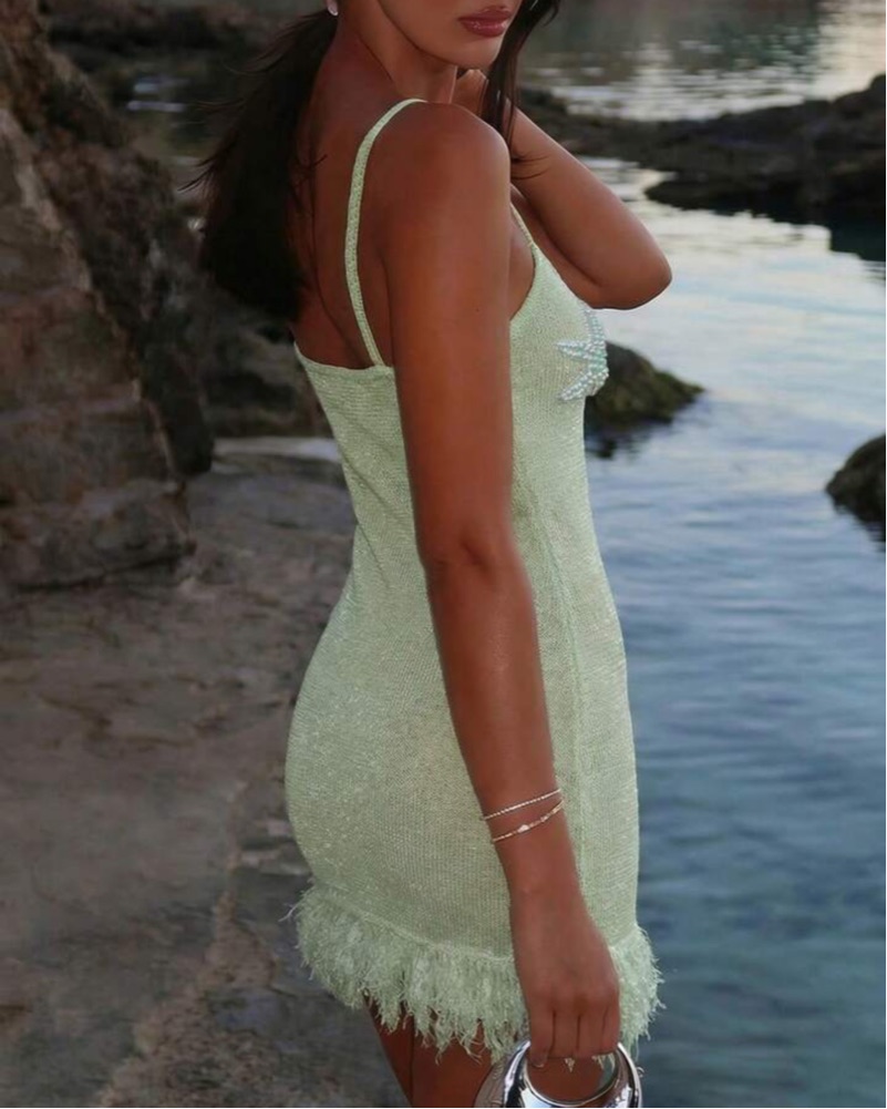 Lightweight knit mini dress in mint green with starfish detailing and fringe hem. Perfect as a beach cover-up or for vacation / beach club outfits. Slightly sheer, best worn over swimwear