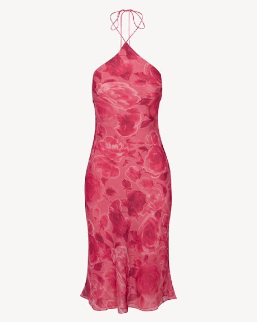 The halter dress that's going to have you moving and shaking. A diamond pointed neckline and low back with a thin rouleau strap to tie at the nape of your neck. She's sexy and double layered - printed on the top and plain underneath giving you total coverage. Midi in length and cut on the bias to sl