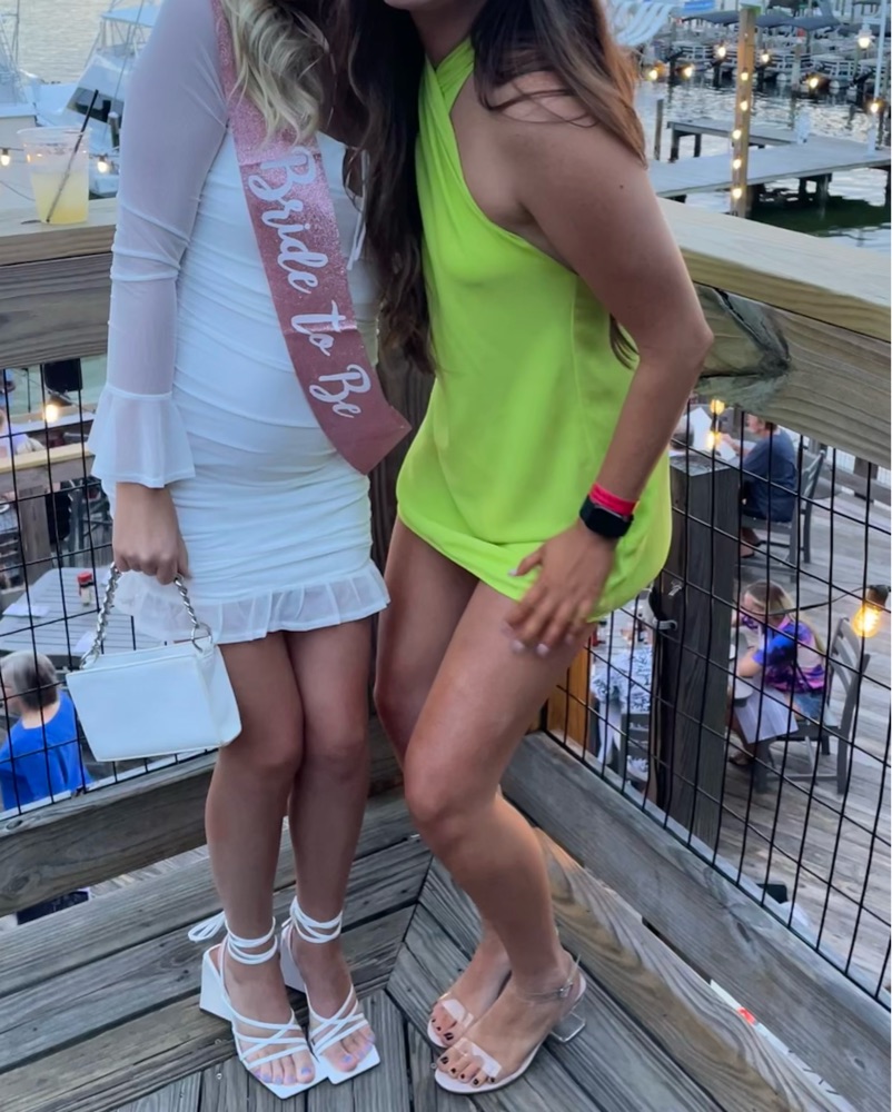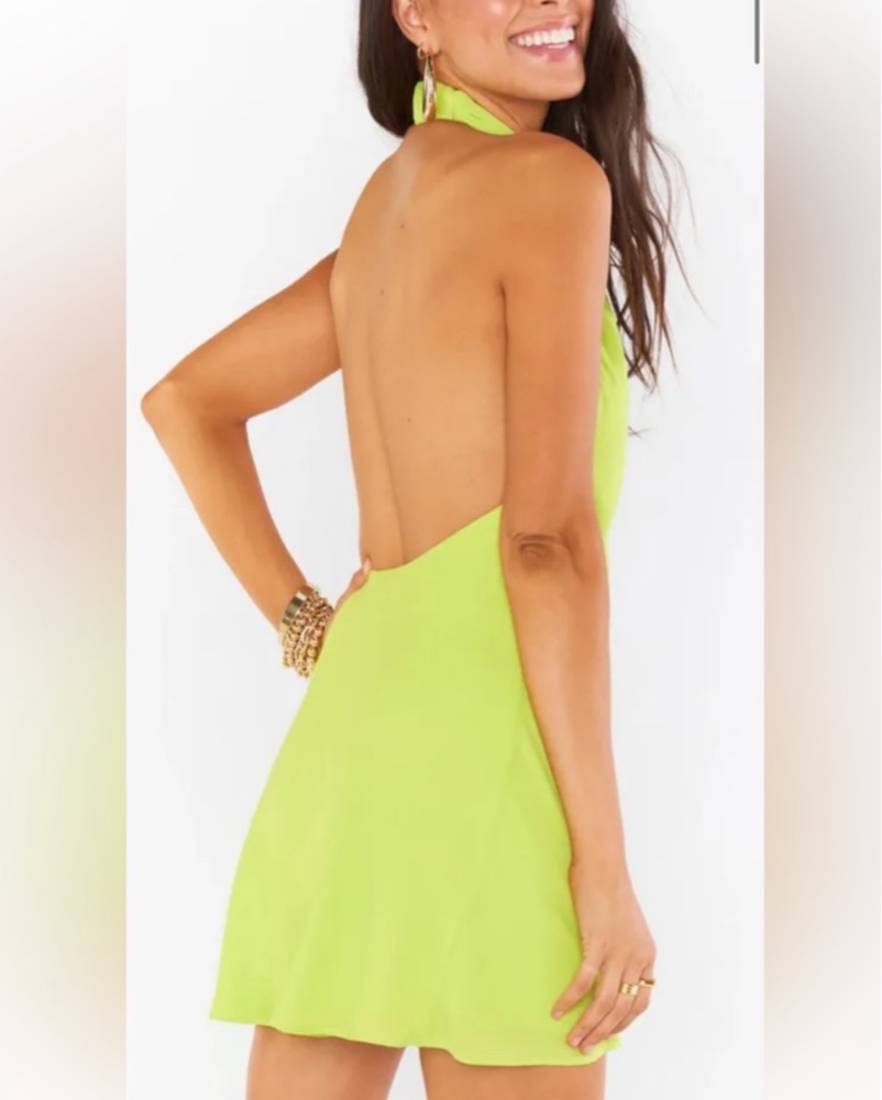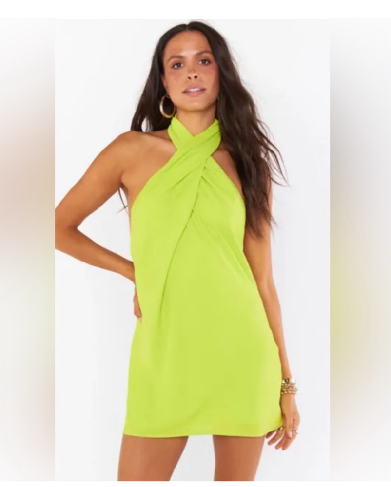 Mini halter dress in citrine green, size small, twist neck with elastic