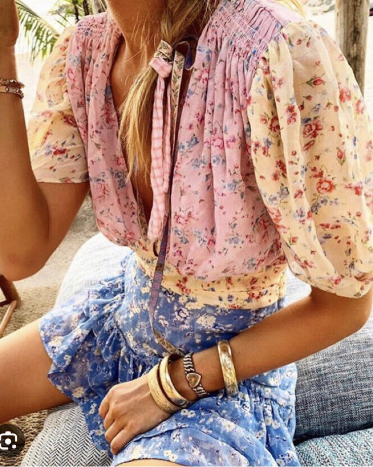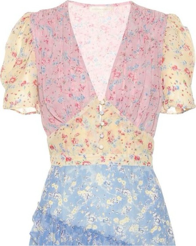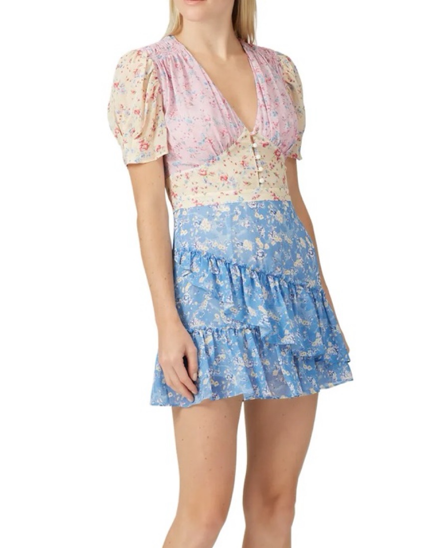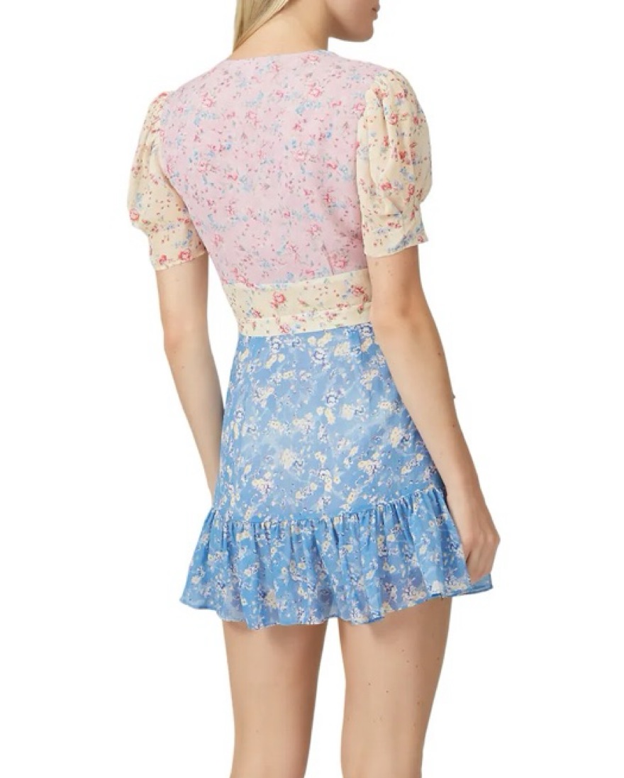 Cut from colorful panels of airy silk-georgette, printed with bouquets of flowers and has romantic puffed sleeves, a deep V-neckline and flouncy ruffled hem! This 100% silk mini dress is size 0. Originally $495