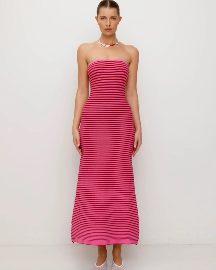 The Sunmor Knit Maxi is here to make a statement. A body con style in our tonal striped knit, the Sunmor is comfort meets sexy. Style the Sunmor as a party dress, cocktail dress or formal dress; whether you dress up with strappy heels and bold accessories, or dress down with flats and a denim jacket