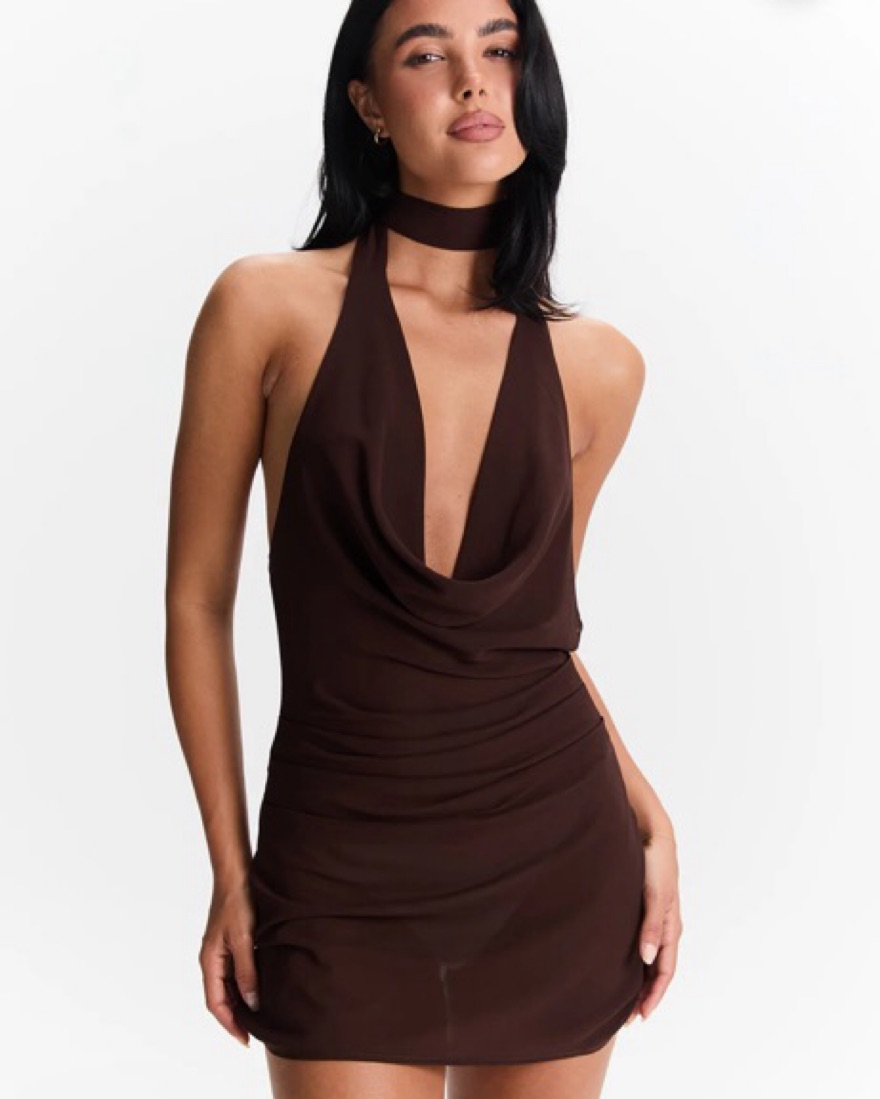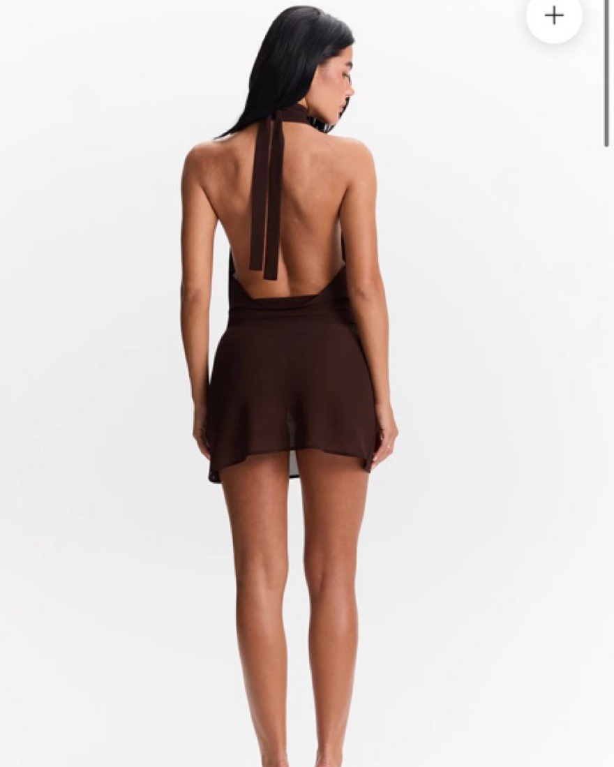 Adorable trendy brown mini dress with option for neck wrap with the straps (last photo shows without). Semi-sheer material (worn with thick tights and was covered). Fits xs/s ☺️