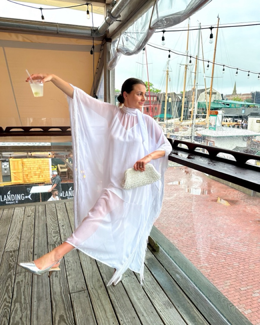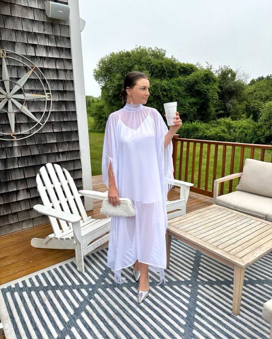 One-of-a-kind, original Tela Mercantile Fringe White Kaftan! Great condition + perfect for a fun event! The kaftan will be sent with a size M silk slip, this slip is not connected to the dress so other slips can be worn with it if you prefer. The kaftan and slip MUST be returned together.
