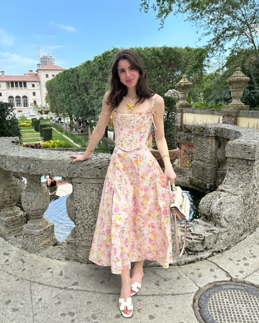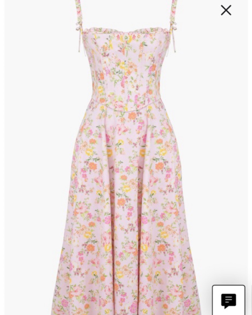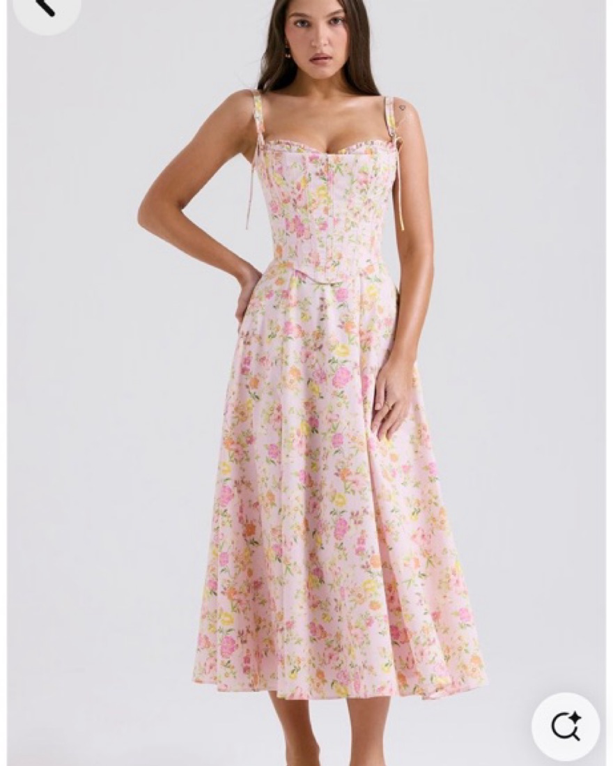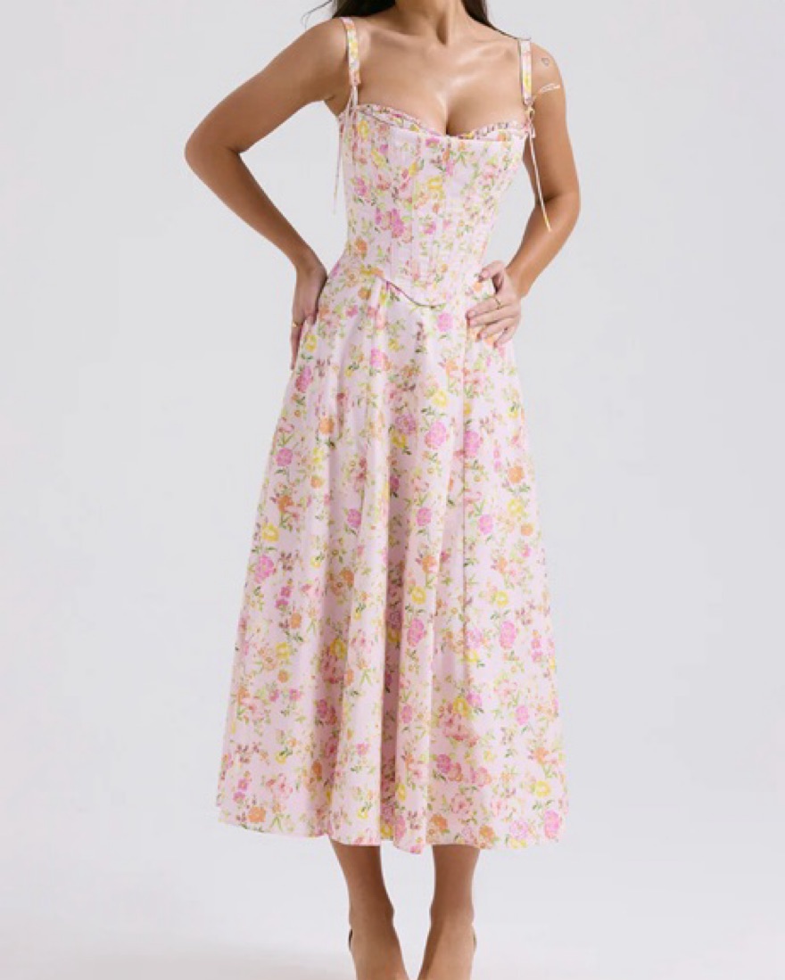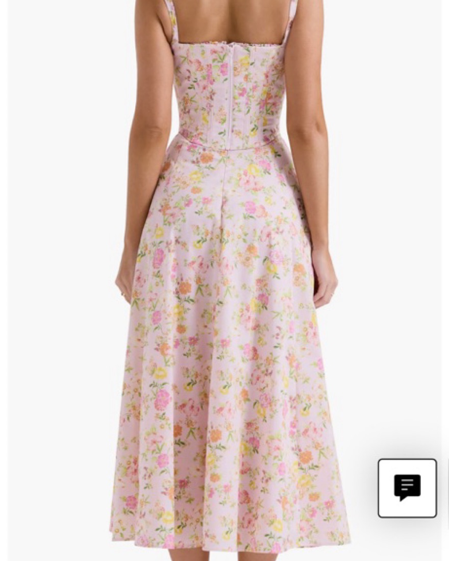 Clarabelle floral print sleeveless midi dress. Corset top is removable.
