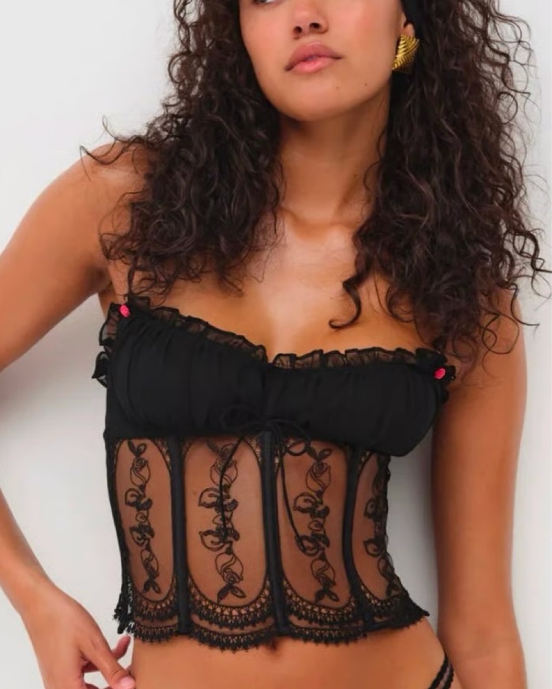 A versatile and flattering bustier that can be dressed up or down. Cute as a going-out top and easy to style for different occasions. Adorable rosette detailing on straps. Size small, never worn, in perfect condition.