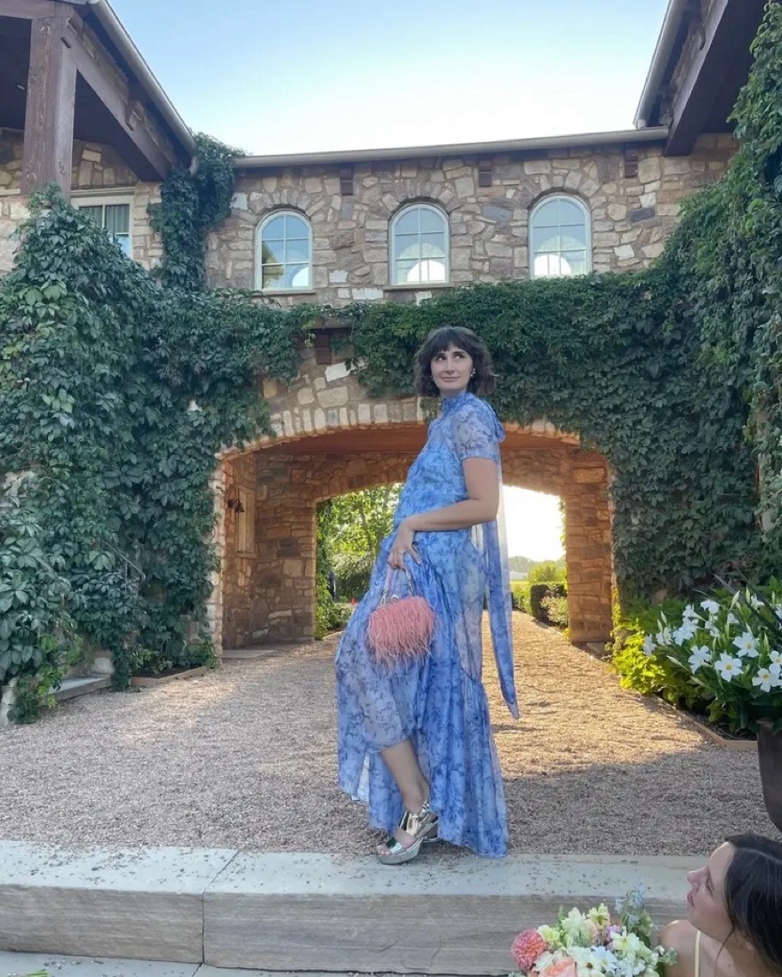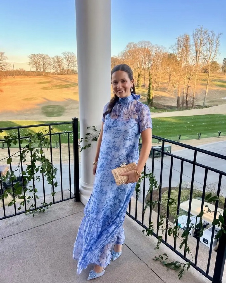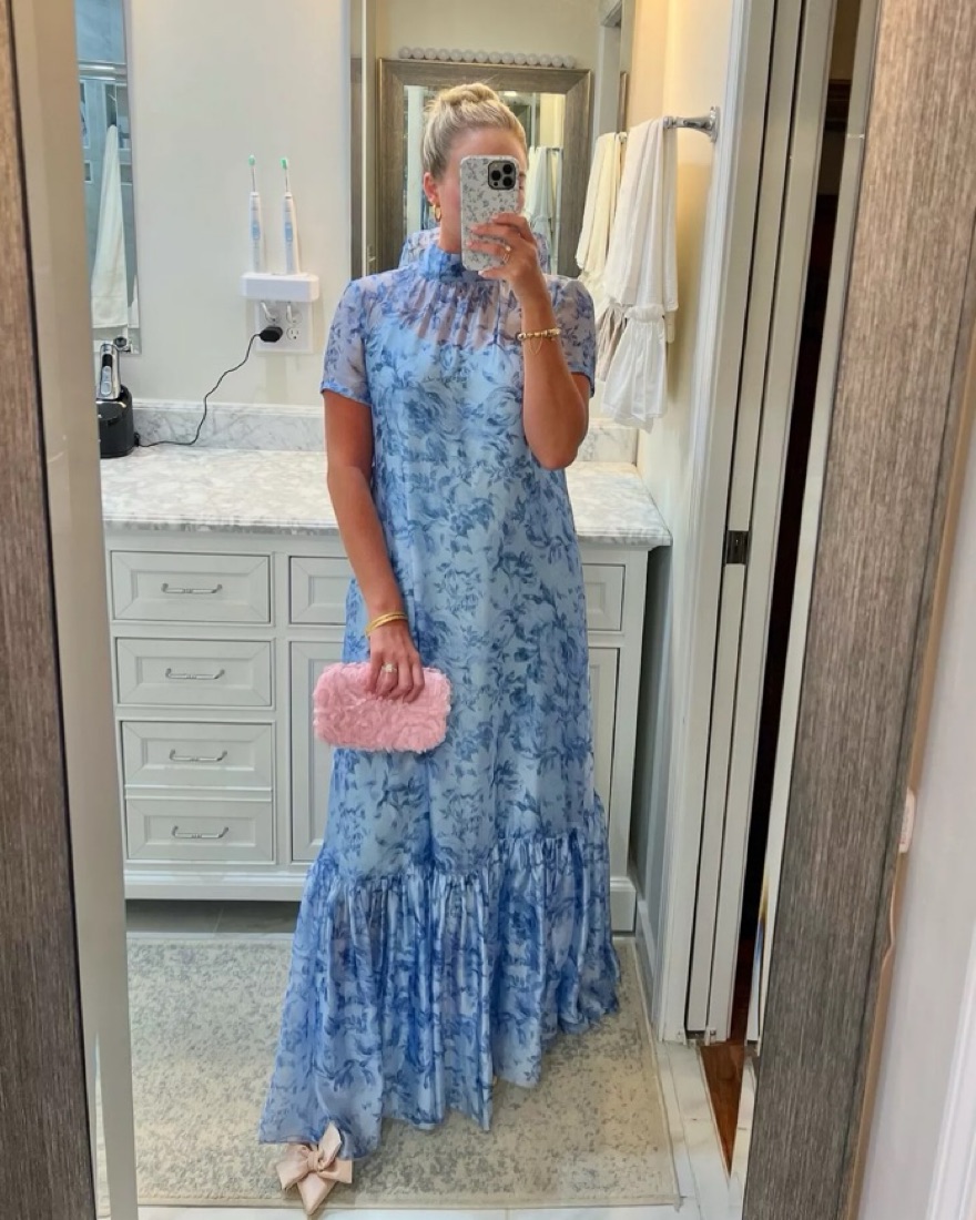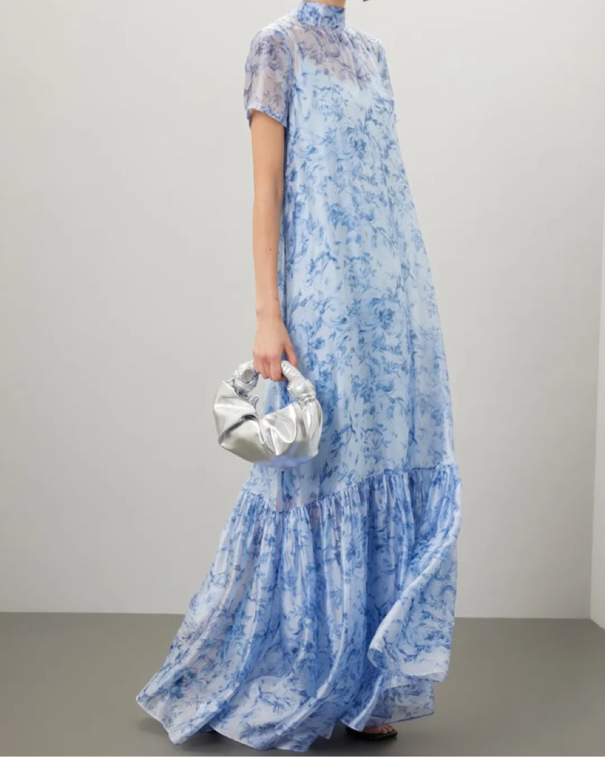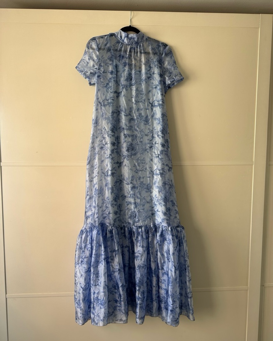 The Calluna Dress is a high neck organza gown with scoop back and functional neck tie. This style features a tiered skirt ruffle hem. Regular length at 58”. Good for anyone 5’5” - 5’8” in heels. This item runs a tiny bit small so will also fit an xs (I am usually a size 2).