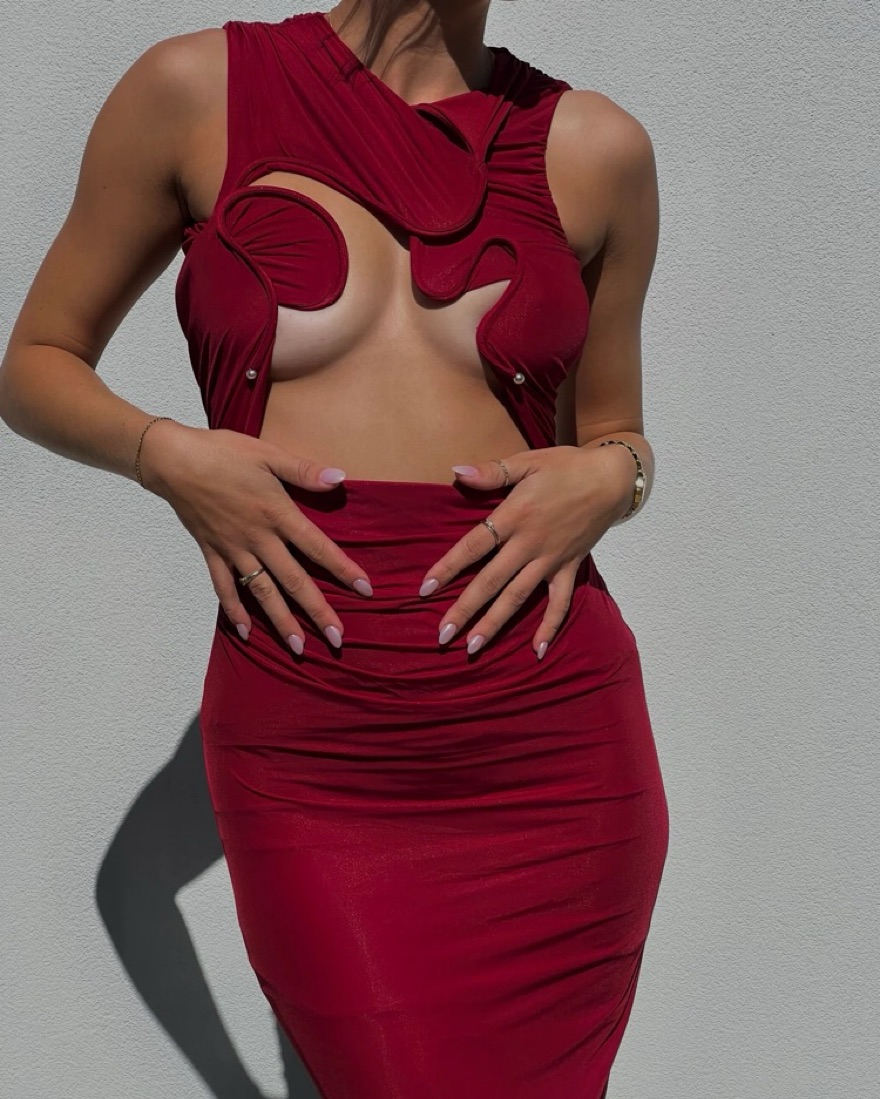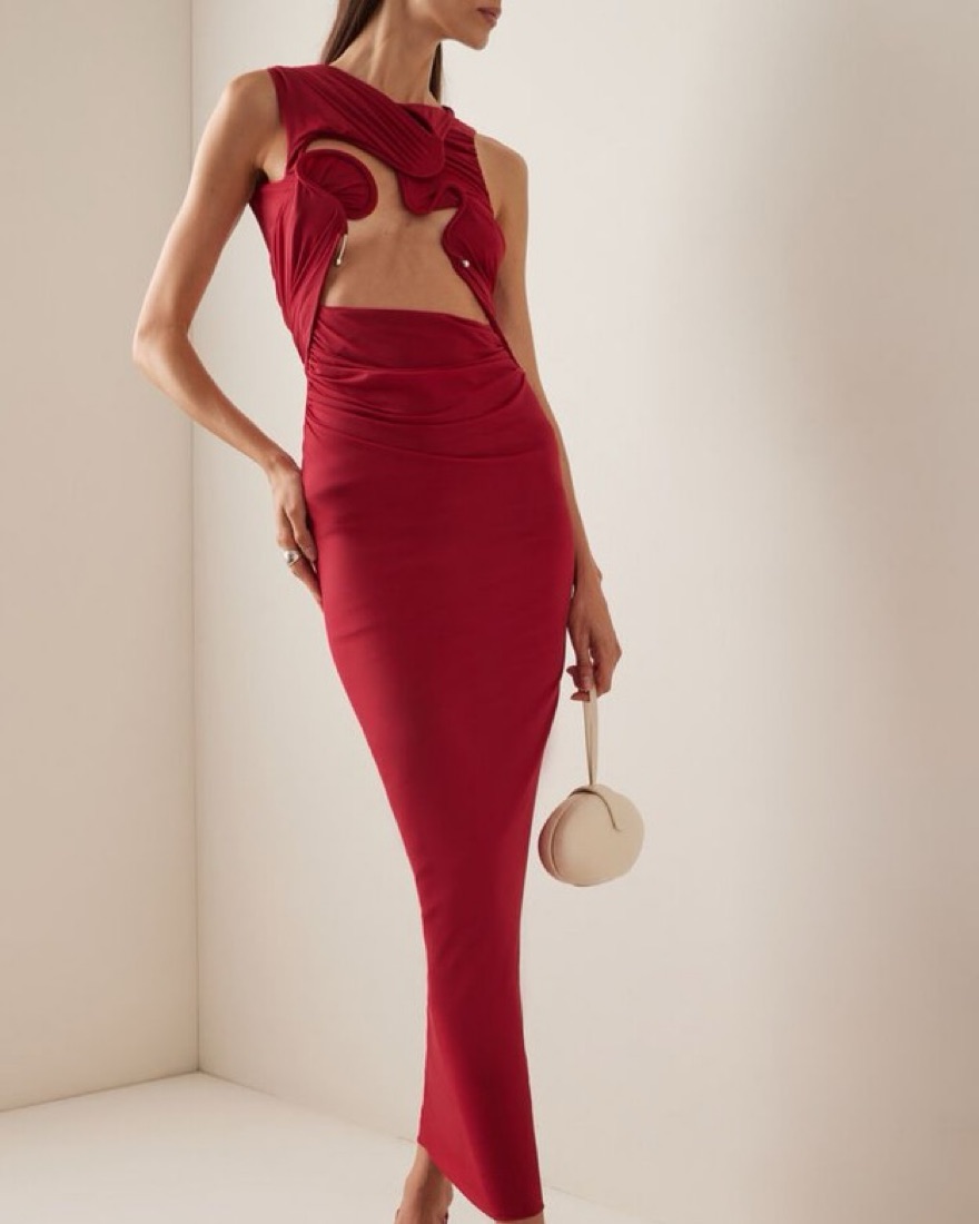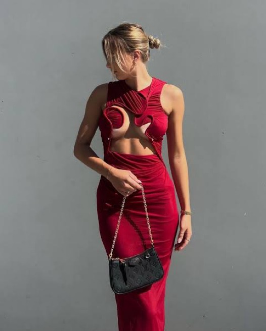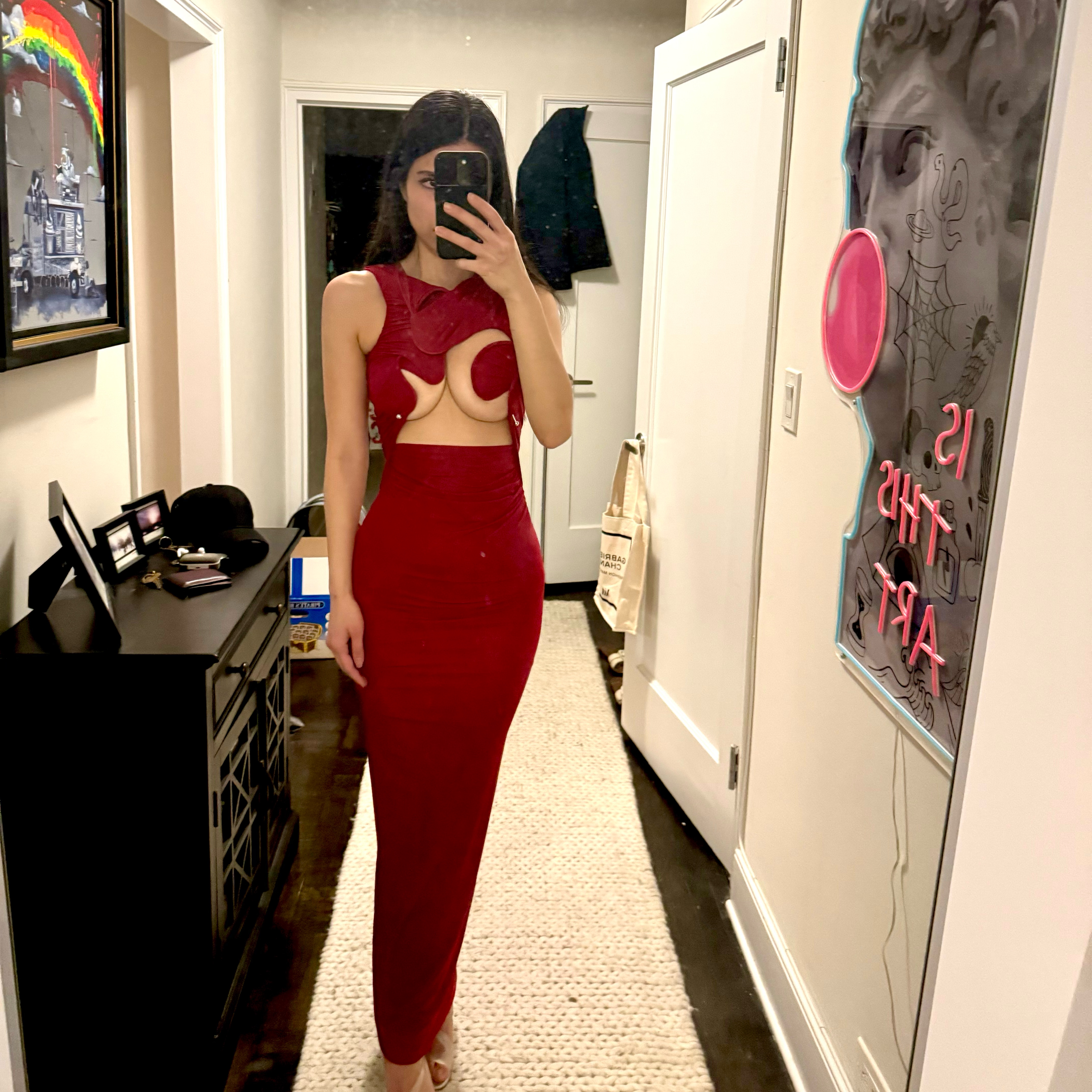 Stunning red Christopher Esber red Venus dress with wire sculptural cutouts for special occassions and vacations. Super unique dress - sold out everywhere.